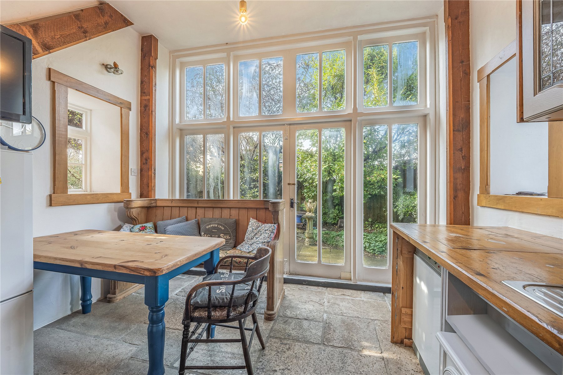 The KITCHEN/BREAKFAST ROOM is bright and characterful, fitted with farmhouse style wall and floor mounted units with wooden worksurfaces and an inset double sink with drainer. There is space for a Rangemaster cooker, fridge/freezer and space and plumbing for a washing machine. Exposed beams and original flagstones sit comfortably alongside modern convenience, and there is ample room for a breakfast table. Fully glazed double barn doors open directly onto the garden, seamlessly connecting the space with the outdoors.