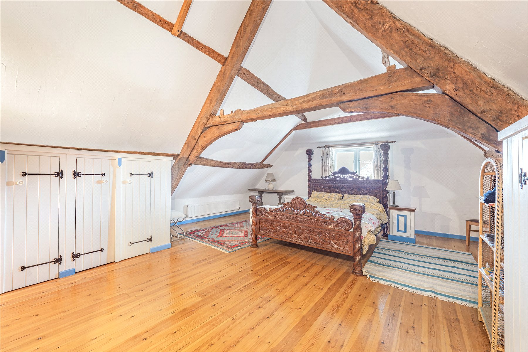 Venturing upstairs, the first-floor landing opens into a substantial principal reception area with exposed beams, providing space for a reading corner and home office. Double wooden doors lead into the PRINCIPAL BEDROOM, a generous double with vaulted ceilings, exposed timbers and built in wardrobes. An ensuite bathroom serves this level, fitted with a panelled bath, wash hand basin and W.C.