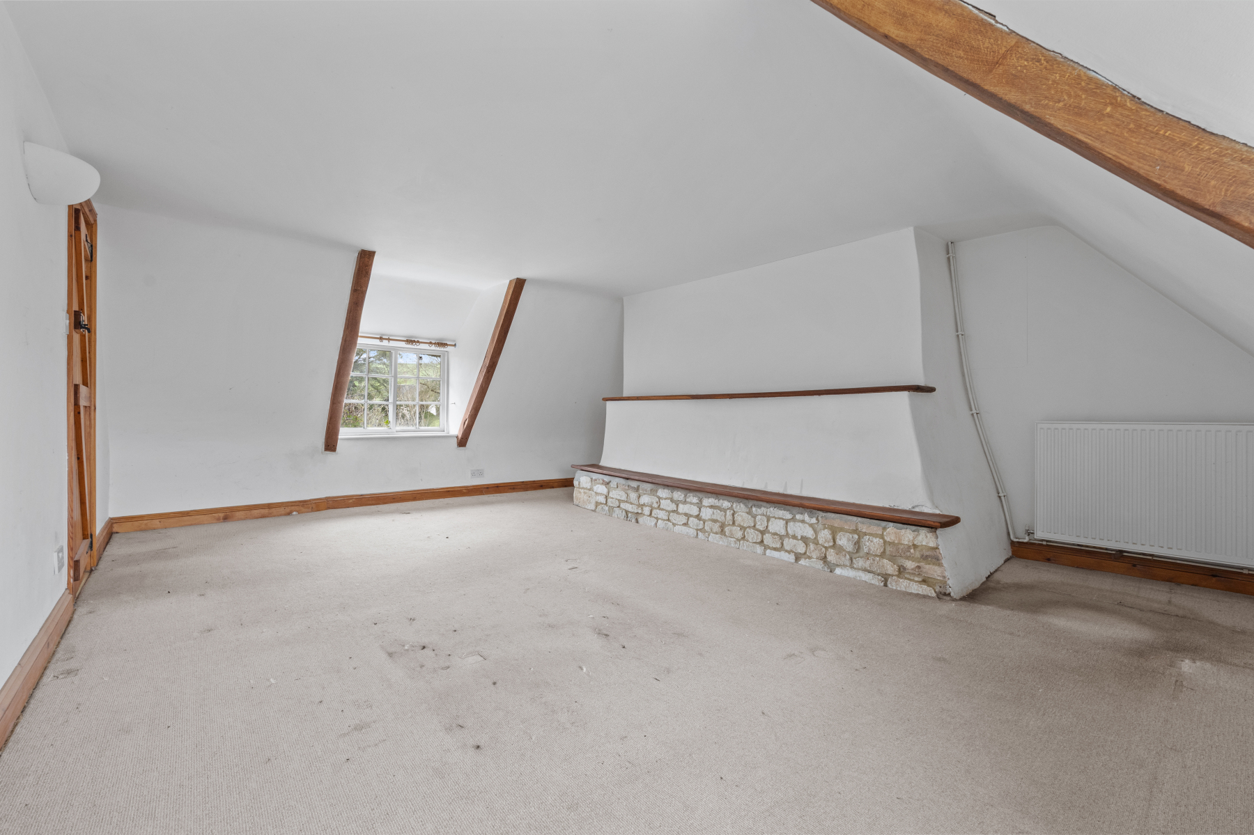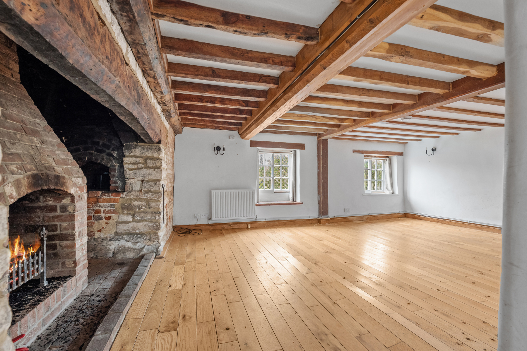 One of the most distinctive spaces within the cottage is the SITTING ROOM, which spans its full depth and showcases the building's timeless charm. Solid wood flooring, an exposed brick fireplace and visible timber beams collectively elevate the room's rustic appeal, creating a warm focal point for daily living. Dual aspect windows introduce balanced natural light, enhancing both brightness and atmosphere. The generous proportions allow for flexible furniture arrangements, making the room suitable for a range of uses while still celebrating its authentic character. This inviting space serves as the heart of the home, offering comfort, charm and versatility.