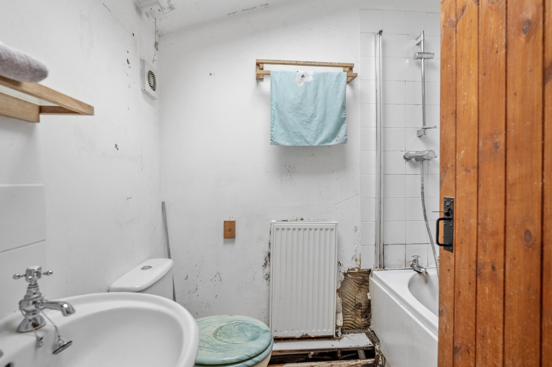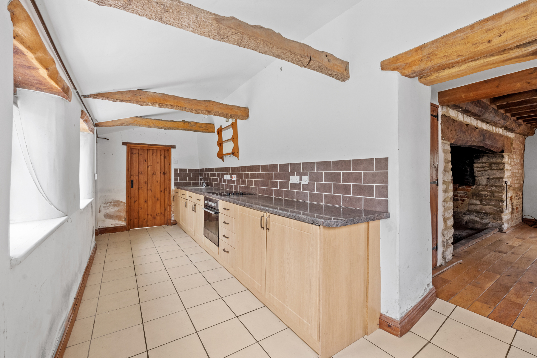 Entering directly from the garden, you arrive in the KITCHEN, a practical and functional space fitted with a selection of floor level units offering useful storage and layout flexibility. Dual aspect windows fill the room with natural light, creating a bright and welcoming environment that provides an ideal foundation for future redesign or reconfiguration. The kitchen's straightforward arrangement highlights its versatility, giving prospective owners plenty of scope to introduce modern touches while maintaining the cottage's inherent sense of history. Its current layout supports everyday living, yet leaves ample room for personal interpretation and contemporary enhancement.