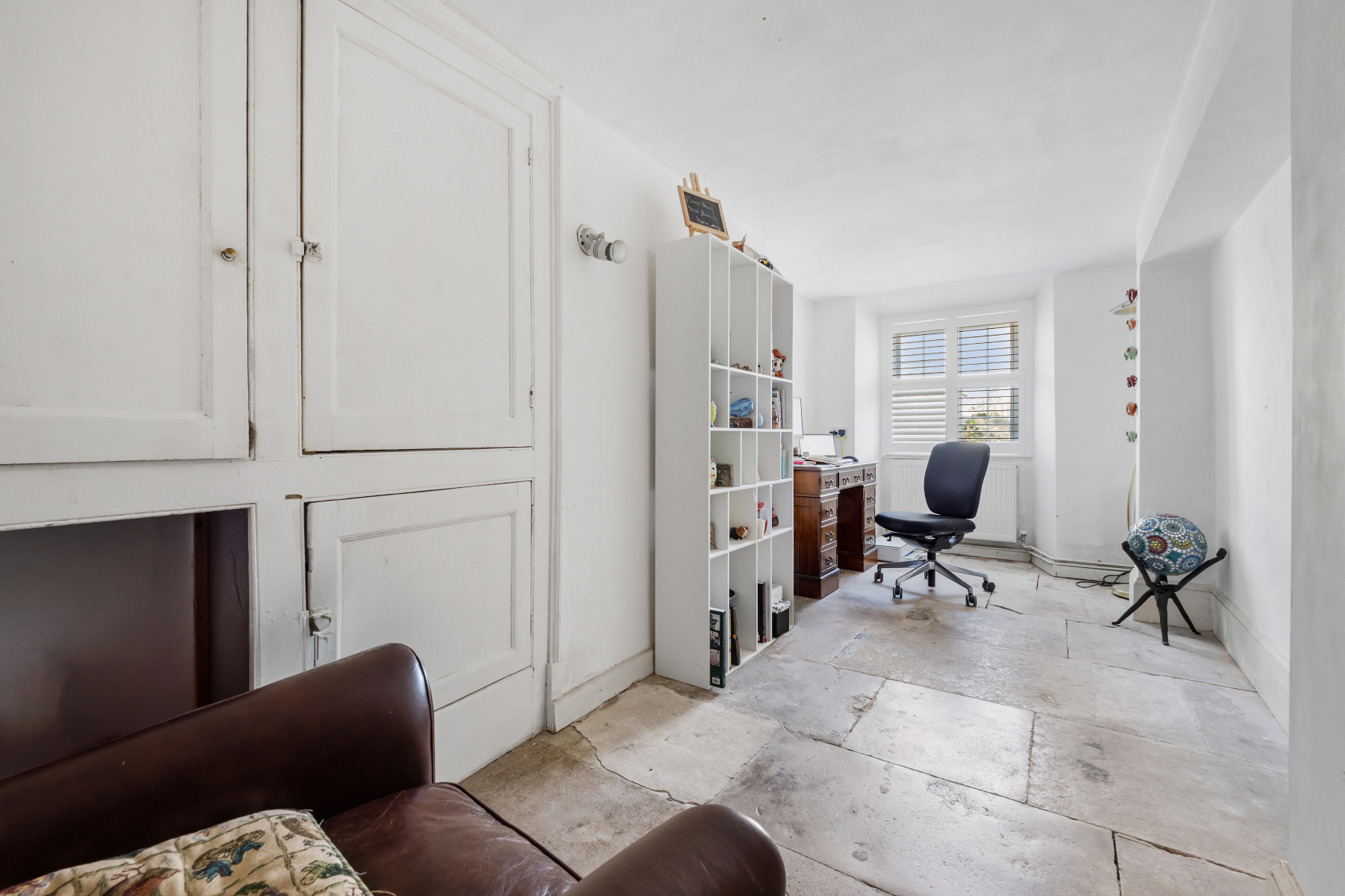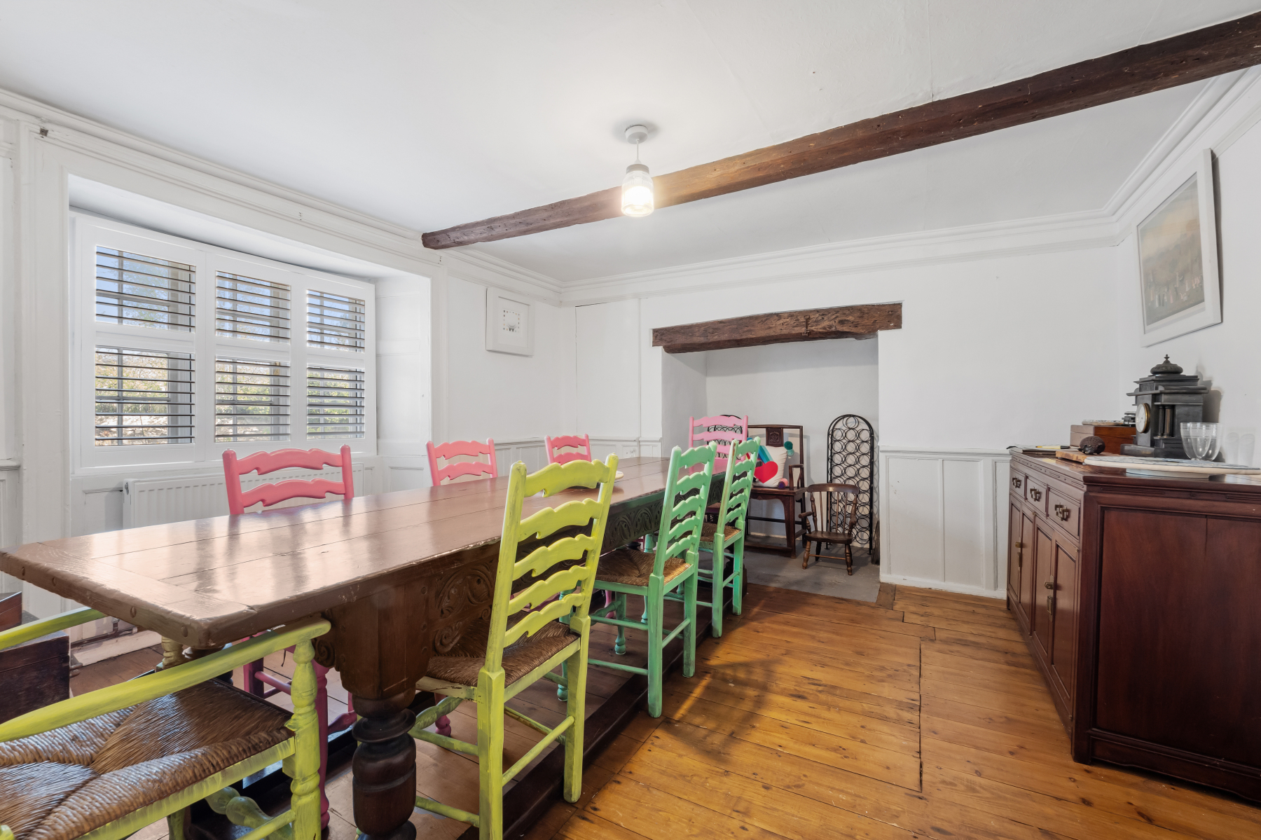 As you enter the heavy period timber front door adorned with original ironmongery the ENTRANCE HALL welcomes with its polished herringbone parquet flooring, one of two staircases ascend to the first floor while doors radiate out to the ground floor rooms. The SITTING ROOM, a spacious retreat featuring a dual aspect with a window seat overlooking the garden. A fireplace with brick hearth and Bio Ethanol stove, adding a cosy feel, centres the room, a timber beam is exposed and adds a touch of historical character. The DINING ROOM, equally inviting, with its bressummer beamed inglenook, stripped wooden floorboards and wall panelling, comfortably accommodates a sizeable table for entertaining and family gatherings. The ground floor also offers a versatile STUDY with flagstone flooring, built-in storage with historical access to the shower room.