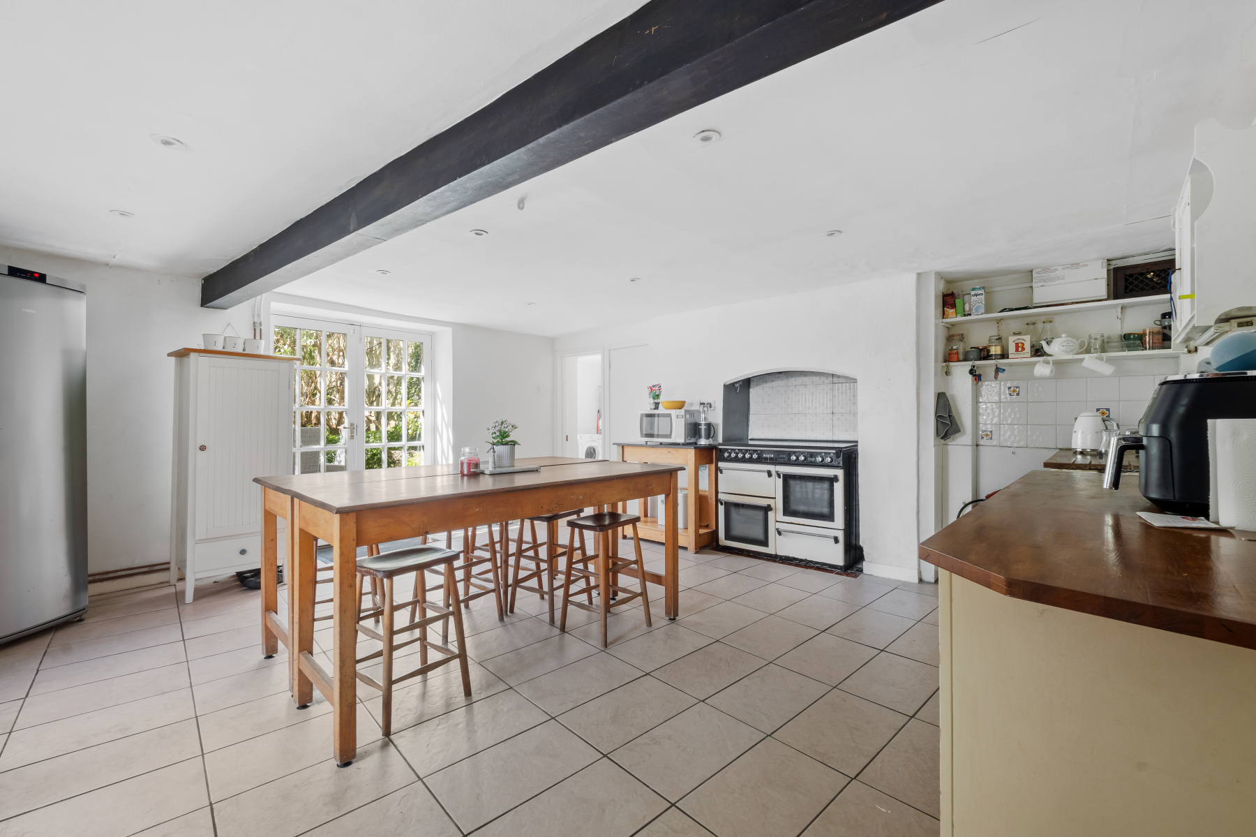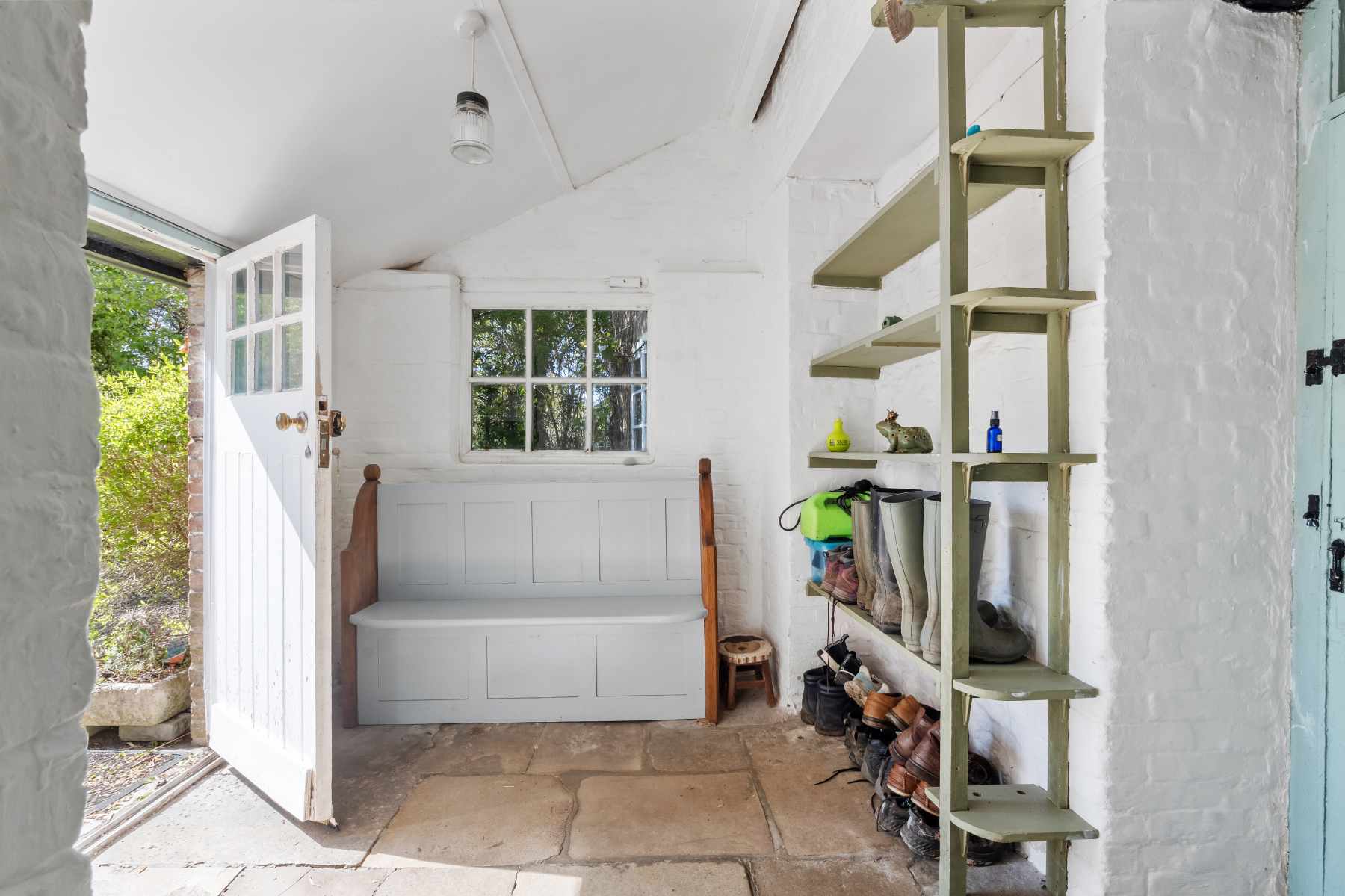The KITCHEN/BREAKFAST ROOM is a spacious, light filled haven, where windows and French doors open to the generous gardens. This room, very much the heart of the home, accommodates a large table, and features simple handmade painted units under a timber work surface with a Belfast sink. There is ample space for modern appliances and an ever useful under stair storage cupboard. Adjacent, the LAUNDRY ROOM with plumbing for a washing machine and space for a dryer with the secondary staircase located here.