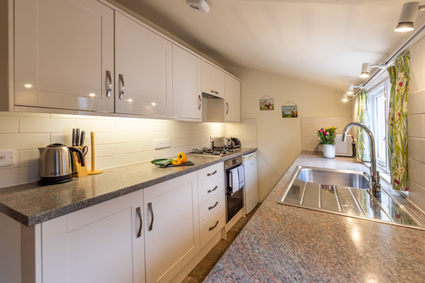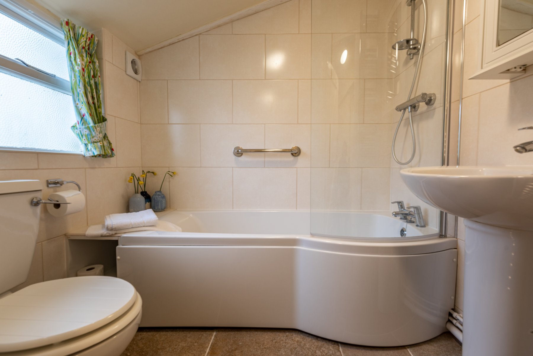 The KITCHEN lies to the rear of the cottage with the sink ideally positioned under the window that overlooks the delightful walled courtyard with stable style door leading to outside. Food preparation work surfaces with cupboards under together with wall mounted cupboards provide for storage. Appliances include Bosch hob with fume hood over together with Bosch oven. There is addition space for a refrigerator and plumbing for a slimline dishwasher. On a practical note, the Worcester gas boiler is also situated in the kitchen. A door leads into the UTILITY ROOM, again with window to the courtyard, here there is a useful storage cupboard and plumbing and space for a washing machine. A further door opens to the BATHROOM. The suite comprises a P shaped bath with mixer tap and shower unit and screen, wash hand basin and W.C.
