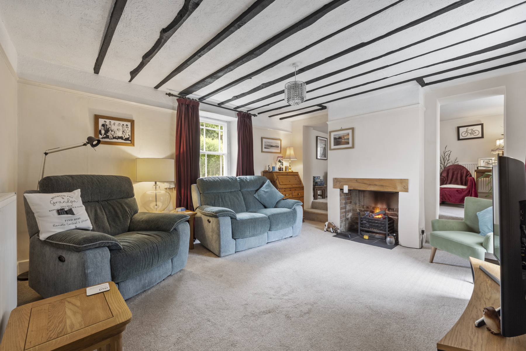 The inviting SITTING ROOM benefits from ample natural light via a secondary glazed window (as elsewhere) overlooking the front garden, road, and ' The Green' with French doors opening onto the rear garden. A charming electric log-burning effect fire forms the focal point. Steps either side of the chimney breast lead to a raised SNUG / STUDY AREA with twin windowsideal for quiet reading or working from home.
