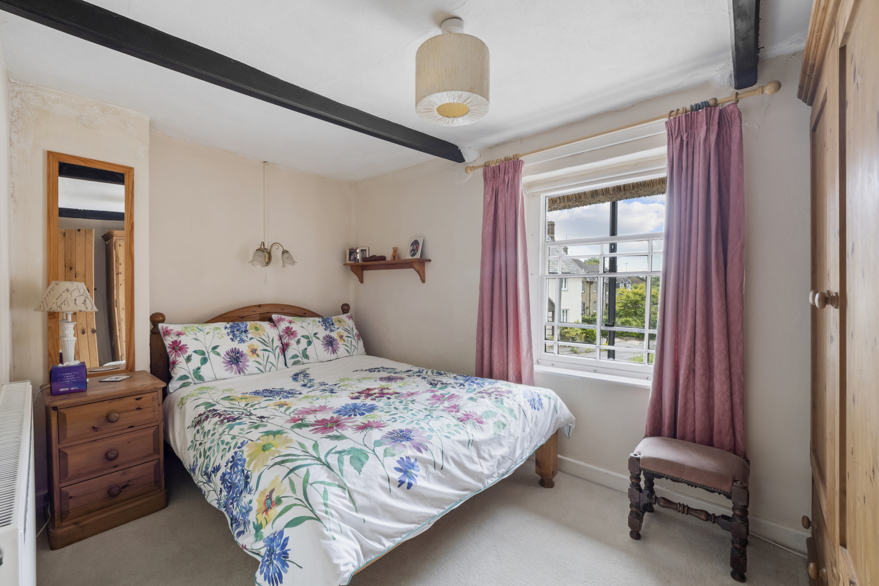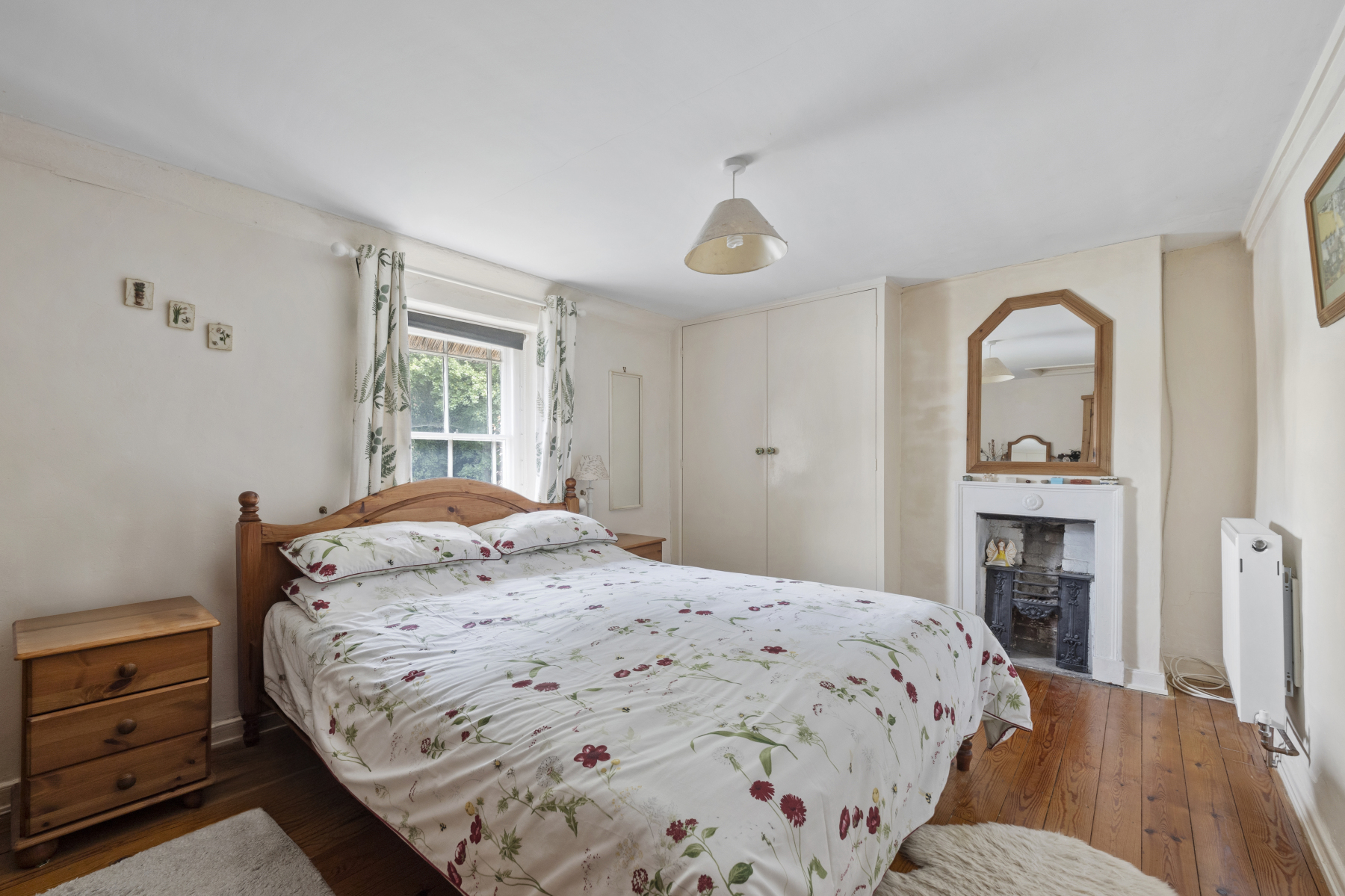 Stairs rise from the hallway to the first-floor landing, which gives access to four bedrooms and a shower room. The PRINCIPAL BEDROOM includes exposed floorboards, a period fireplace, and built-in cupboards. BEDROOMS TWO and BEDROOM THREE overlooks the village, while bedroom four lies to the side. The SHOWER ROOM is fitted with a corner shower, basin with storage, W.C., and heated towel rail.