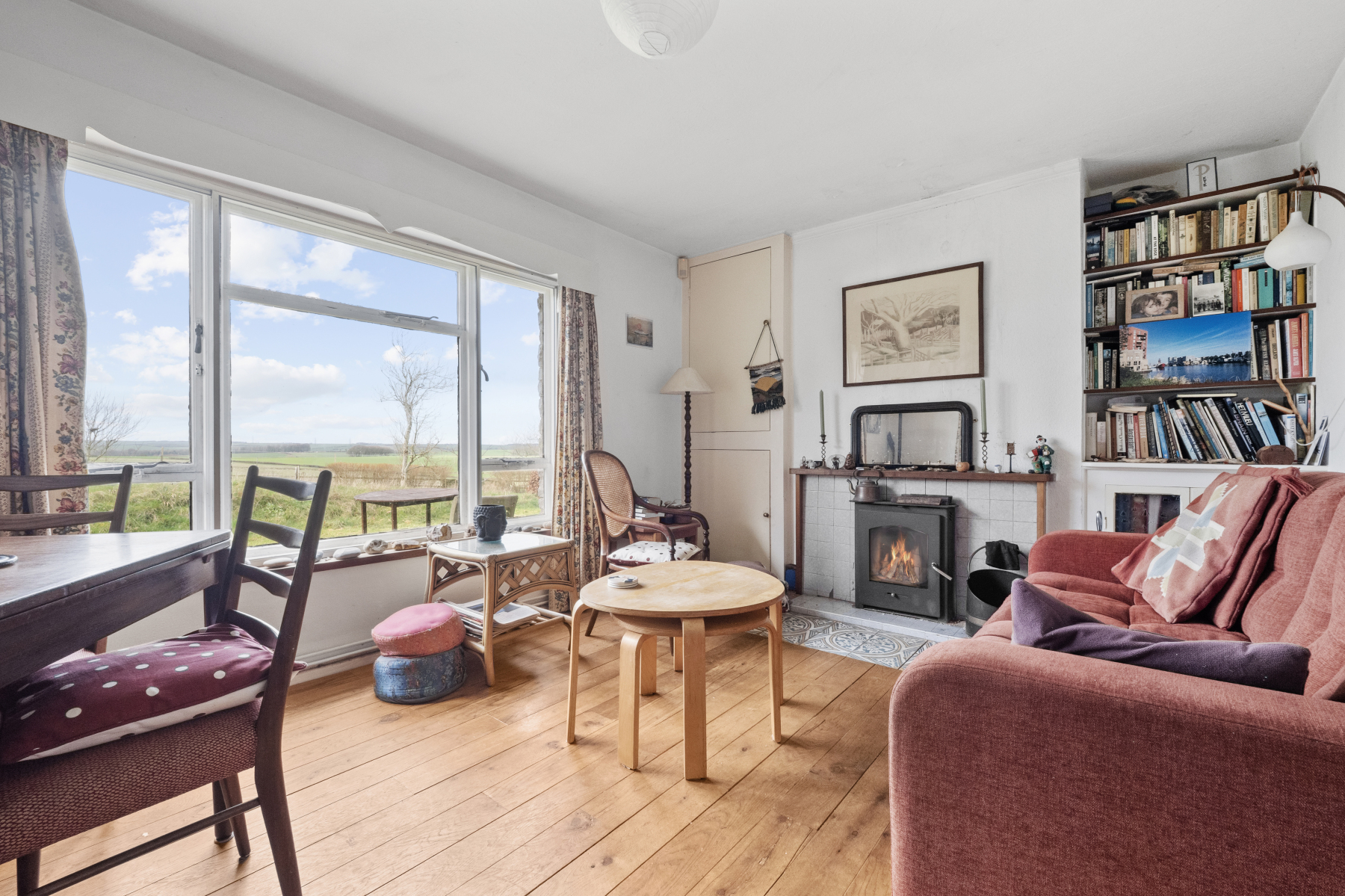 From the kitchen, a door leads into the DINING ROOM, which overlooks the rear garden and surrounding countryside. The room includes built-in storage and a log burner, providing a warm and inviting setting for entertaining, suitable for both relaxed family meals and formal gatherings.