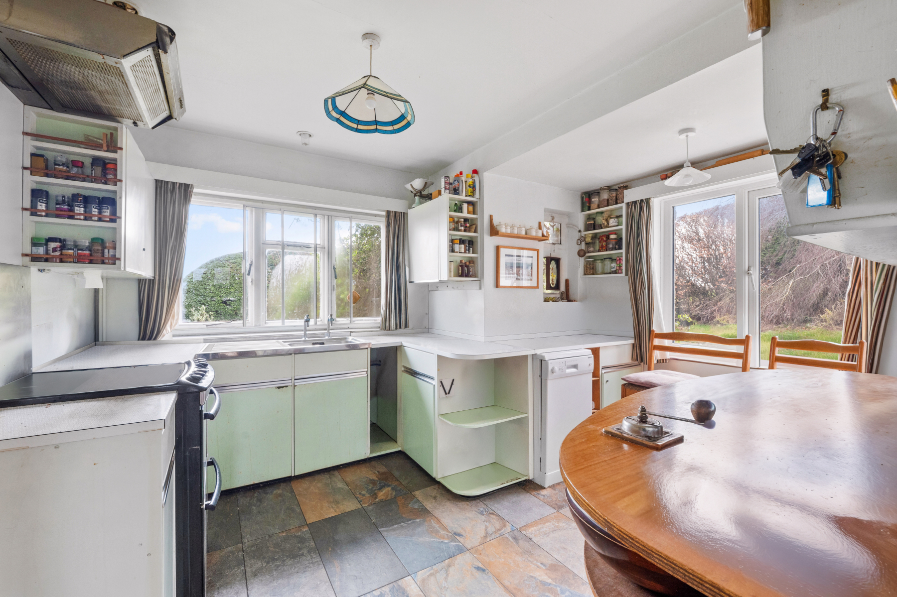 Upon entering, you are welcomed by a spacious ENTRANCE HALL complete with built-in storage. A door leads through to the KITCHEN, which is fitted with a comprehensive range of wall and floor-mounted units, providing ample storage and space for appliances. Dual-aspect windows create a light and airy atmosphere.
