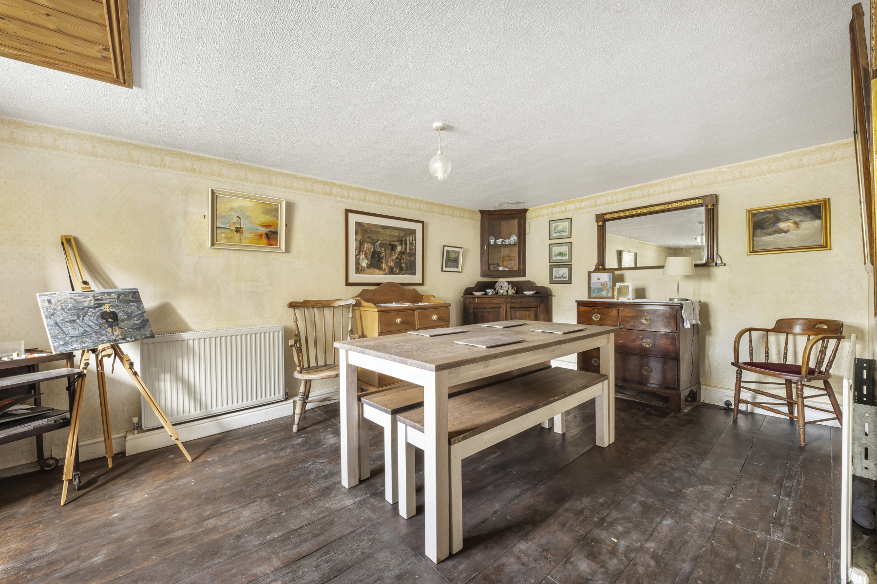 The front facing DINING ROOM with exposed timber floorboards and window seat, offers generous space for a family table and chairs, providing versatility to serve as a second sitting room/snug or study if preferred.