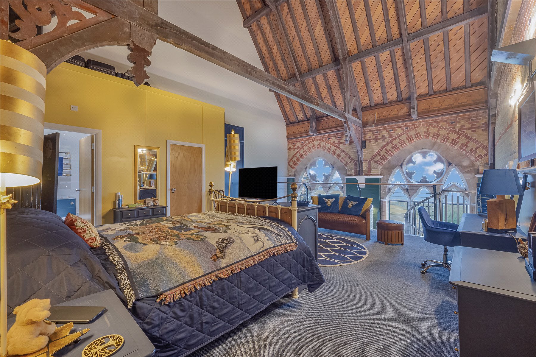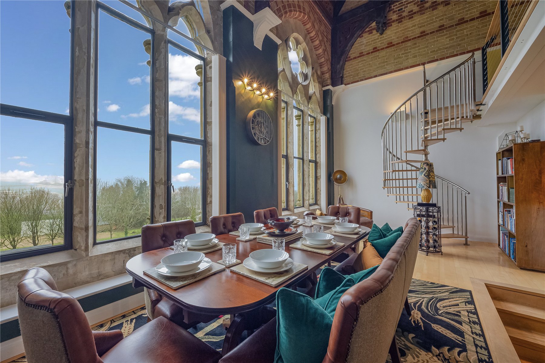 An original Gothic door opens into the open plan KITCHEN/SITTING/DINING ROOM, a striking living space fitted with polished timber flooring and set beneath a full height vaulted ceiling with exposed beams. The room is centred around two Gothic stone mullion windows, which frame far reaching views across the communal gardens, the village cricket ground and towards Dorchester and Poundbury on the distant horizon, while allowing natural light to flood the south facing interior. Much of the apartment's original detail remains in evidence, including exposed brickwork noted in Pevsner's Buildings of England, together with the Gothic doors and vaulted ceilings.