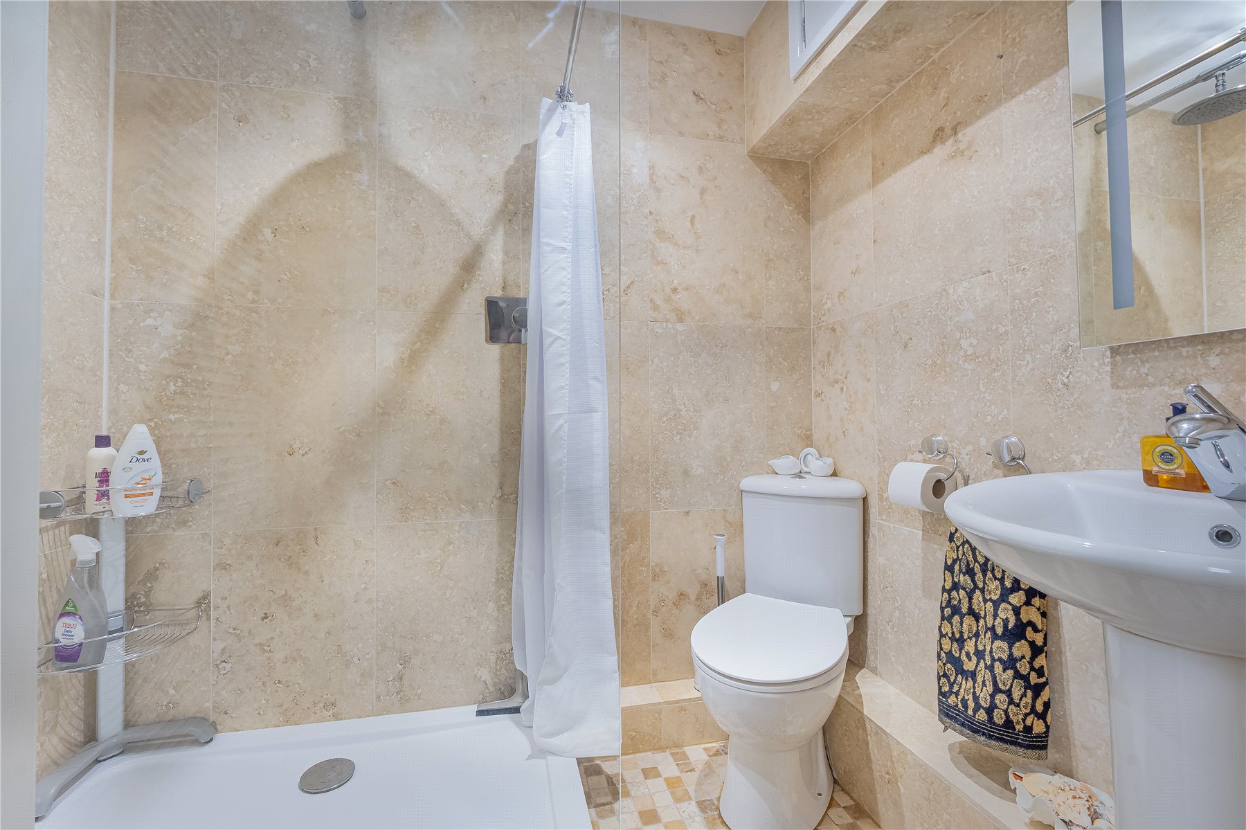 The front door opens into the ENTRANCE HALL, providing ample space for greeting guests and accessing the main living areas. Underfloor heating runs throughout the apartment, adding to the overall comfort and practicality of the space. A SHOWER ROOM is discreetly positioned and fitted with tiled flooring, a shower cubicle, pedestal wash hand basin, W.C., and with the gas fired boiler neatly housed here.