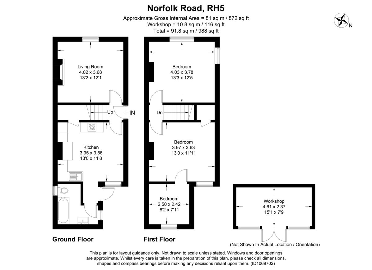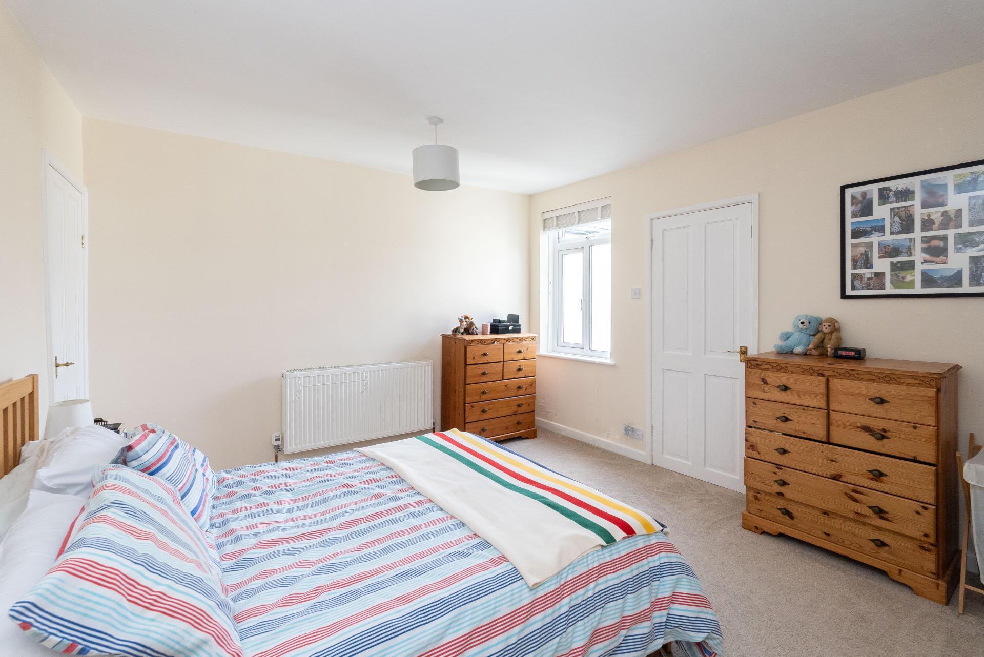Stairs rise to the first floor, granting access to the bedrooms and loft access. The second bedroom overlooks the charming local church and offers ample space measuring 13'3ft x 12'5ft, being able to accommodate a superking-size bed and additional furnishings. The sizable primary bedroom includes a substantial built-in wardrobe and connects to an adjoining single bedroom, enjoying views of the garden and Redlands Wood beyond.