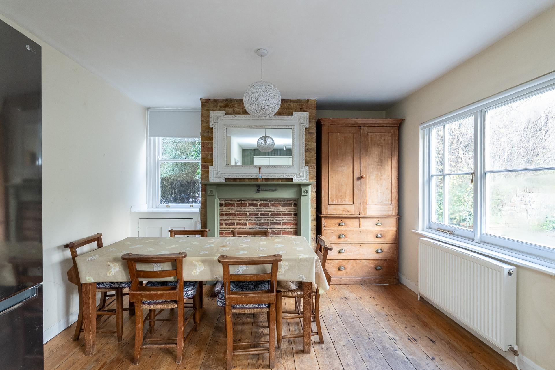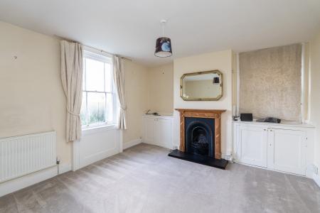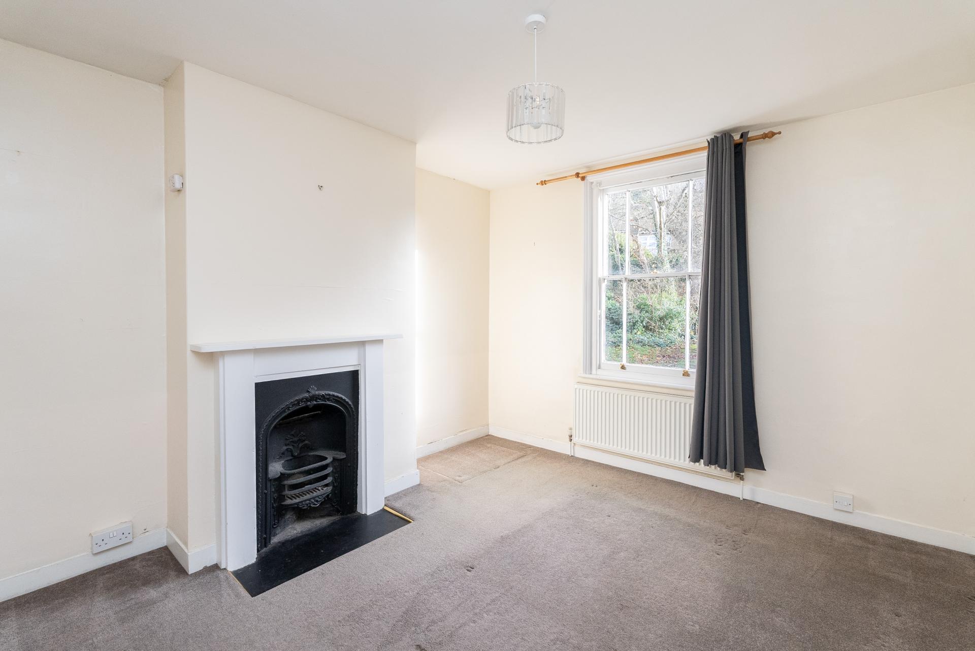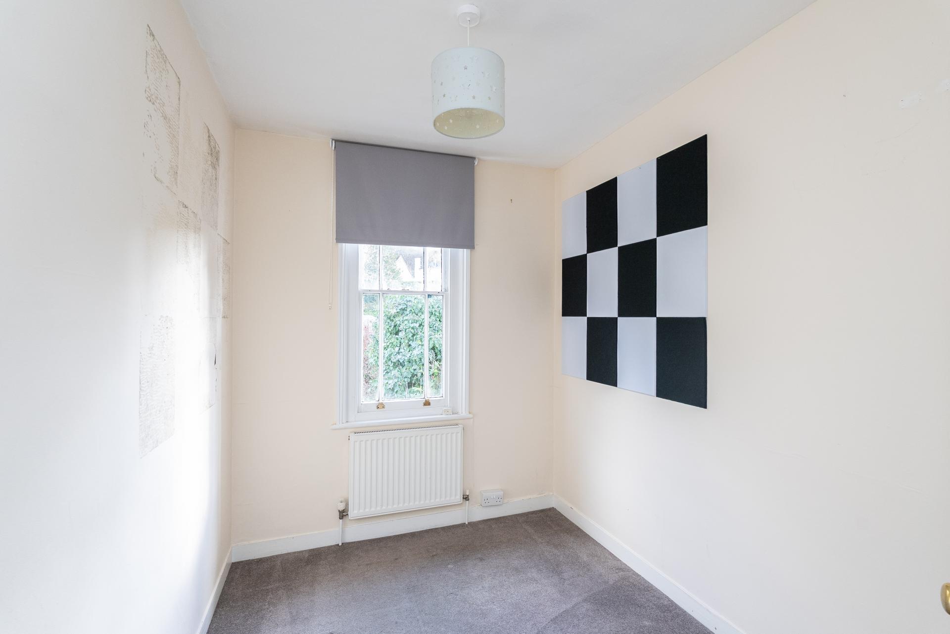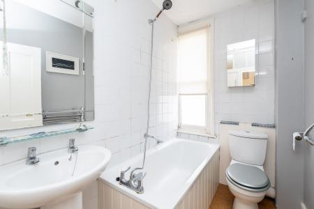 Upstairs, a bright and open landing gives access to the bedrooms. The generous principal bedroom sits at the front and comfortably accommodates a king-size bed with room remaining for freestanding furniture. The two further bedrooms are positioned at the rear, overlooking the appealing garden. All bedrooms feel light and uplifting thanks to their substantial original sash windows. A family bathroom with a classic white three-piece suite completes the first-floor layout.