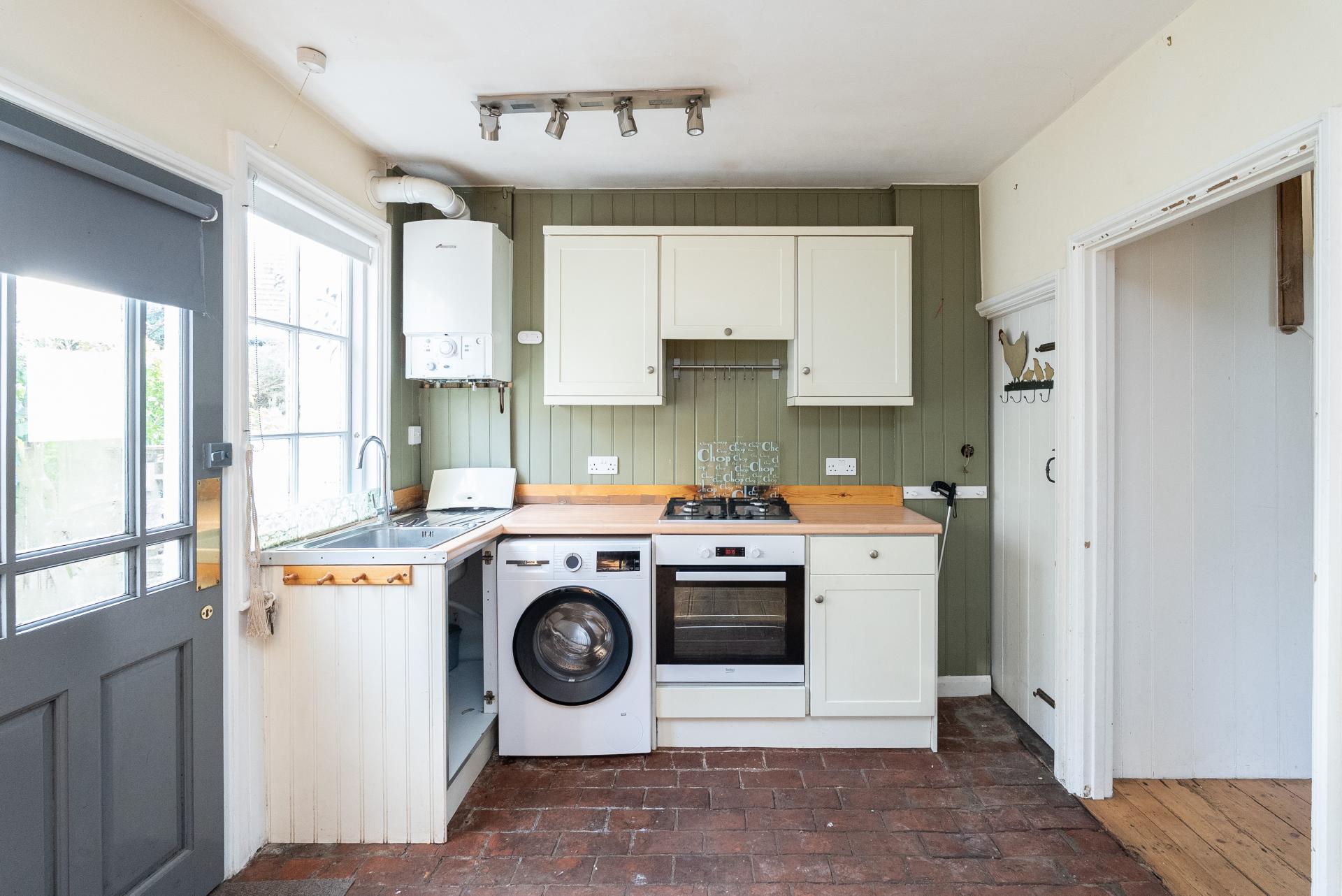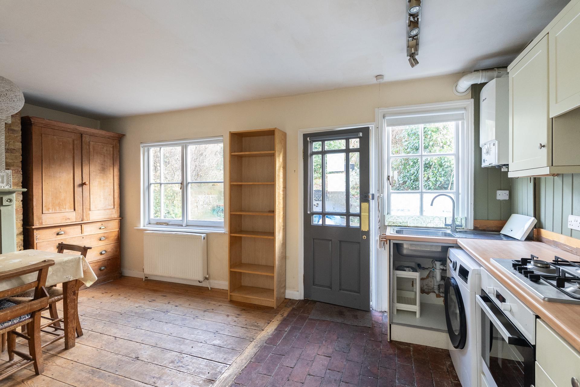 The property offers a new owner the wonderful opportunity to update and even extend STPP. The accommodation starts via a private front door into a hallway that links all ground-floor rooms. The lounge sits at the front and features a fireplace and traditional wooden sash windows. This inviting room offers a warm and relaxing atmosphere with plenty of space for comfortable seating with ample built-in storage. To the rear is the kitchen/diner, enjoying lovely views over the charming garden. The kitchen includes a selection of bespoke fitted base and wall units, ample worktop space and room for freestanding appliances. A brick fireplace and original beams add a striking sense of historic character, while large wooden windows fill both rooms with abundant natural light. Stairs from the kitchen descend to a sizeable cellar with windows, currently used as a utility and storage area, an extremely practical and valuable addition.