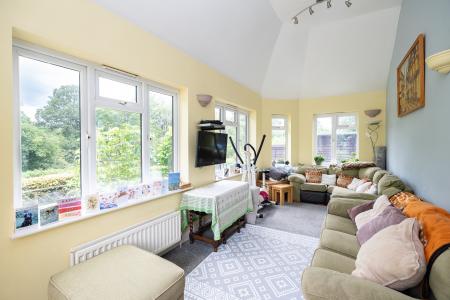Adjacent to the kitchen is the inviting lounge, which also enjoys garden views and direct access via another set of French doors. This lovely living area benefits from high vaulted ceilings, creating a sense of space and airiness, while offering a relaxing setting.