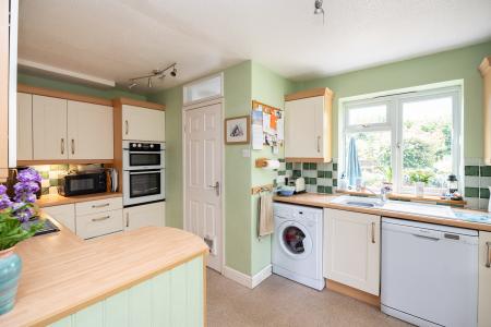 This delightful property begins in a welcoming entrance hall, featuring a handy storage area for coats and shoes. From here, stairs rise to the first floor, while a door leads directly into the front-aspect dining room. This space is wonderfully bright, thanks to French doors that open out to the side of the garden and there's ample room for a dining table and chairs, perfect for both everyday meals and entertaining. Flowing seamlessly from the dining area is the rear-aspect kitchen, which is well-appointed with a range of storage units, generous countertop space and room for freestanding appliances. A large window offers a pleasant outlook over the rear garden, filling the space with natural light. Just off the kitchen is a practical downstairs W/C, complete with a wash basin, a convenient addition for guests and daily use.