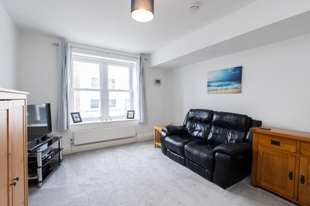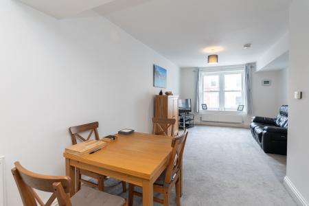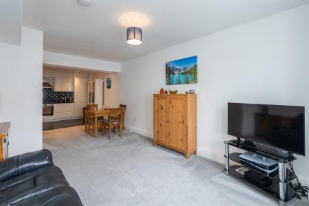 Originally converted into apartments in 2008, the building benefits from a secure communal entrance. From here, a staircase leads to the first floor, where a private front door welcomes you into the apartment. The heart of the home is the spacious open-plan kitchen, dining, and lounge area. Thoughtfully designed with defined zones, this space is both practical and stylish. The modern kitchen boasts sleek white cabinets, integrated appliances, and ample worktop space, all complemented by sophisticated black tiling that adds a touch of elegance. The living area is bathed in natural light, courtesy of large windows that offer a charming view over the high street. There is ample space for a comfortable sofa and additional lounge furniture, making it an ideal spot to relax or entertain. The dedicated dining area comfortably accommodates a table and chairs, creating the perfect setting for meals and social gatherings.