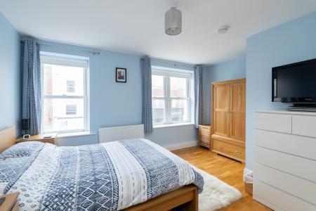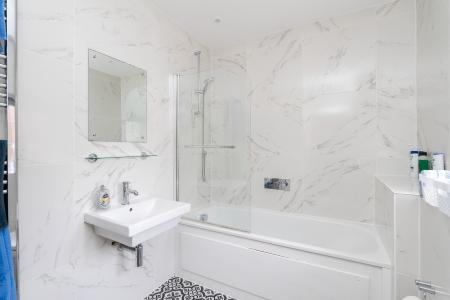 The primary bedroom is a generously sized double, featuring two large windows that flood the room with light. The space offers ample room for a double bed, freestanding storage solutions, and additional furnishings to suit your needs. A second room, currently used as a large single bedroom, provides additional versatility. This space could easily serve as a home office, guest room, or nursery. There is ample space for a bed, wardrobe, and other furnishings. Completing the accommodation is the updated, stylish and contemporary bathroom. It features a white suite, including a bath with an overhead shower, a floating sink that maximizes floor space, and luxurious tiling throughout, creating a sleek and polished finish.