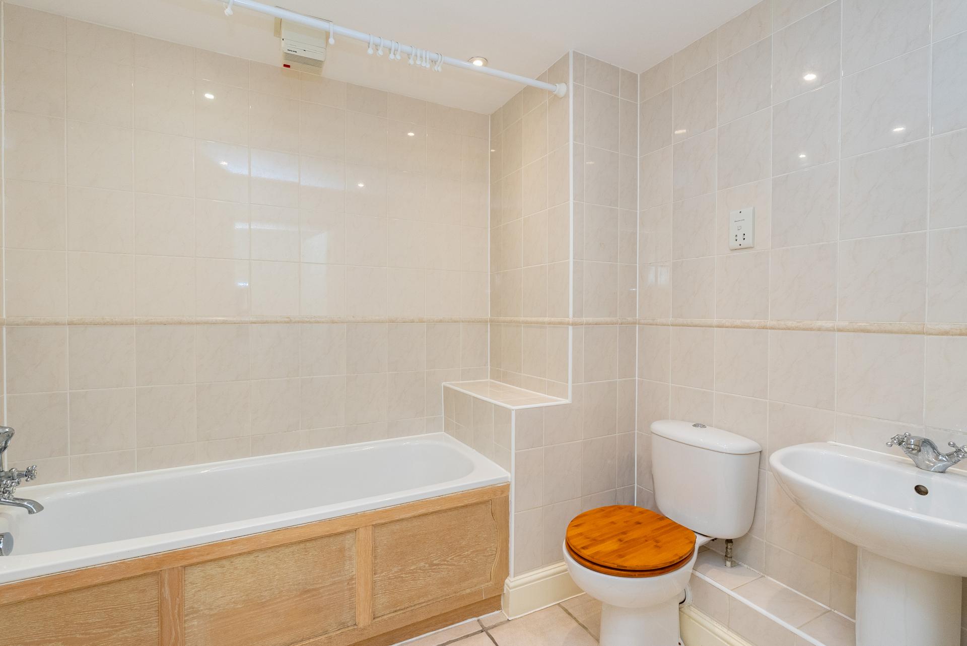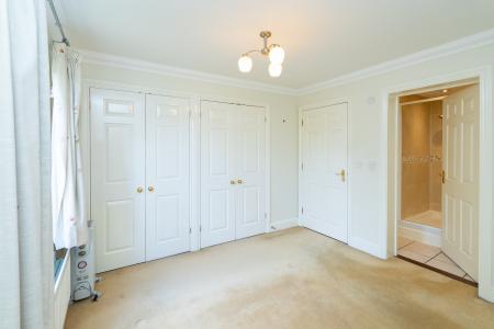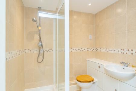 Both bedrooms are well-proportioned doubles. The principal bedroom includes fitted wardrobes and an en suite shower room. The second double bedroom also lends itself well to use as a home office. A white bathroom with bath and overhead shower attachment serves the second bedroom and completes the accommodation.
