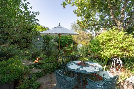 To the front, the property is approached via a brick-enclosed garden with steps leading up to the front door. The rear garden has been thoughtfully landscaped and enjoys a variety of established shrubs and screening trees. It is predominantly laid to patio and features an ornamental pond, along with a traditional outbuilding providing useful storage. A mature wisteria adorns the rear elevation, offering a stunning display when in bloom. The property also benefits from a practical side access.