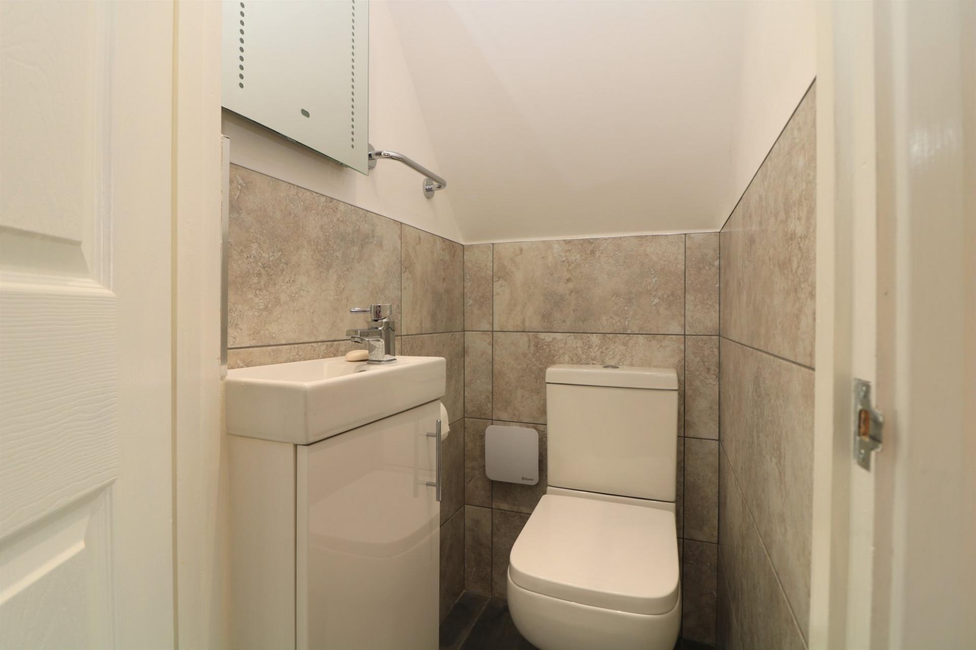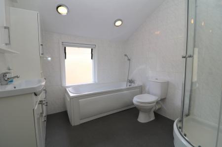 Upstairs, the property offers two well-proportioned double bedrooms, both featuring built-in storage. The bathroom is fitted with a modern white suite and includes both a full size bath and separate shower cubicle.