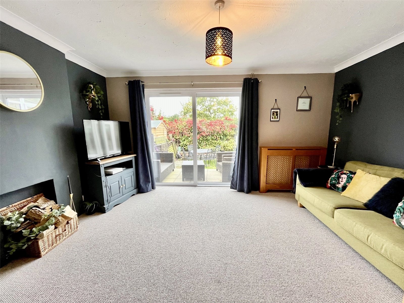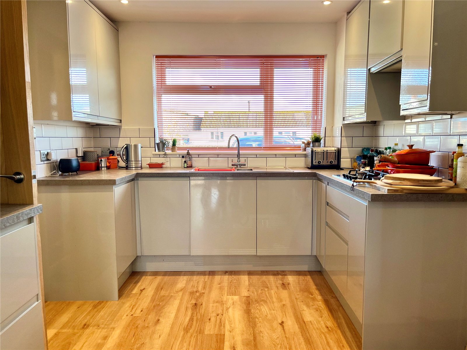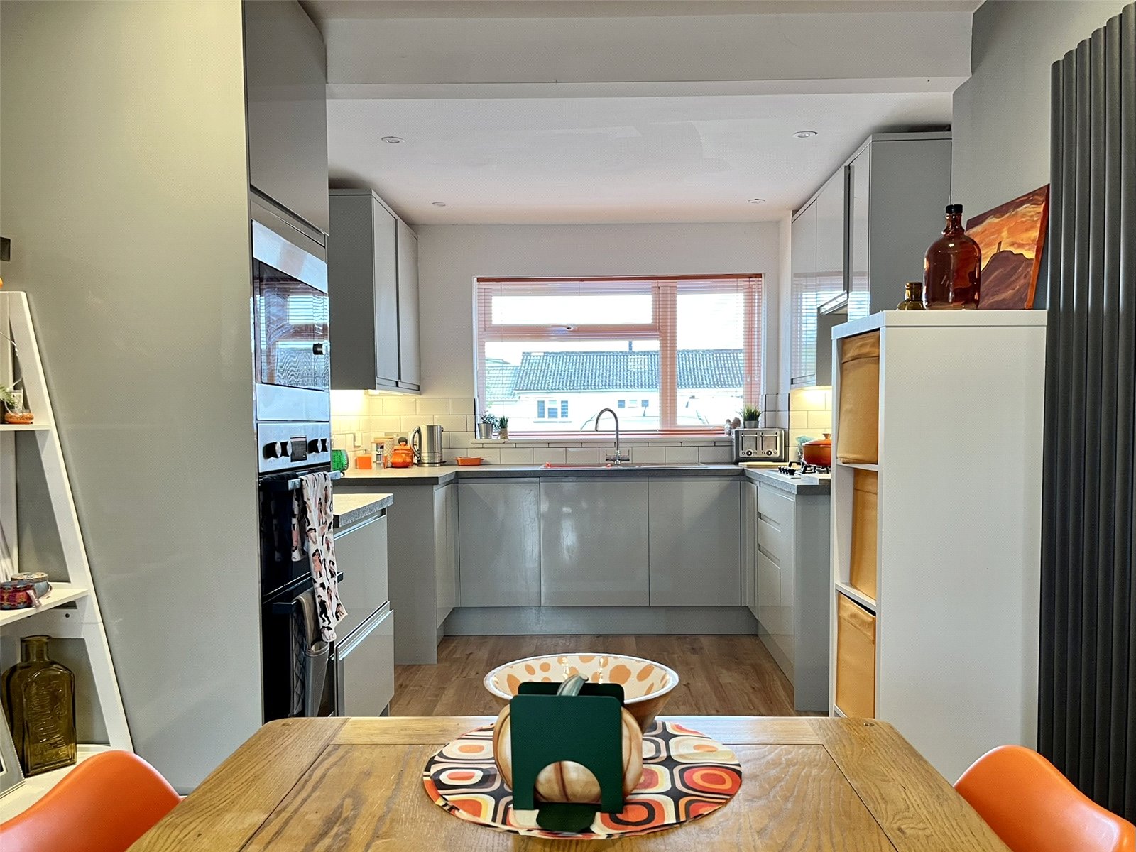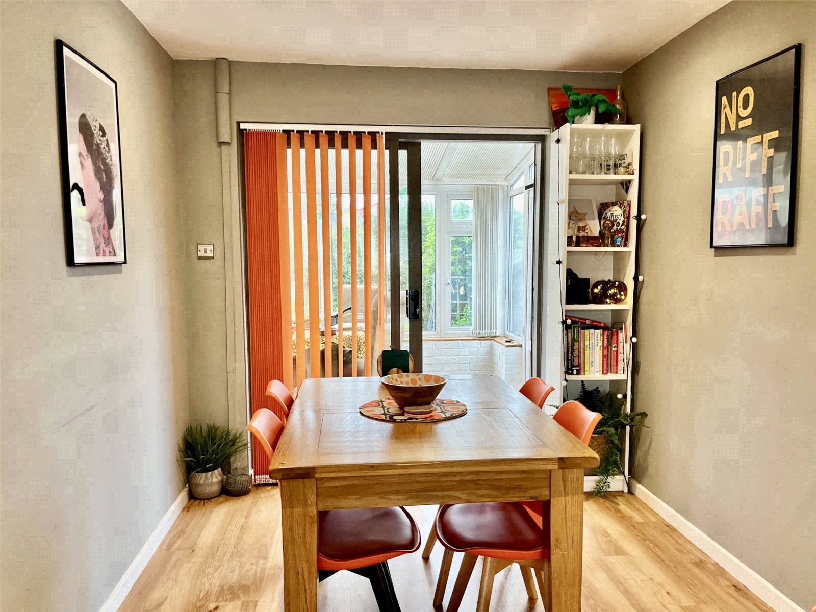 The sleek high-gloss kitchen is a chef’s dream, with a dining area ideal for family meals. The lounge offers a relaxing retreat with sliding doors to the garden, and the conservatory provides a peaceful view of the private outdoor space. The ground floor includes a utility room and WC. Upstairs are two double bedrooms and a versatile third room. The stylish shower room features a walk-in rainfall shower. Outside, enjoy off-road parking for two cars, a nearby garage, and a westerly-facing garden perfect for alfresco dining.