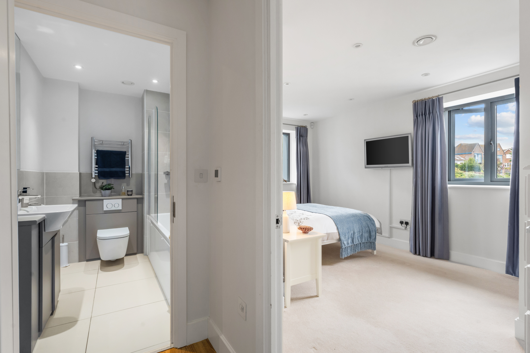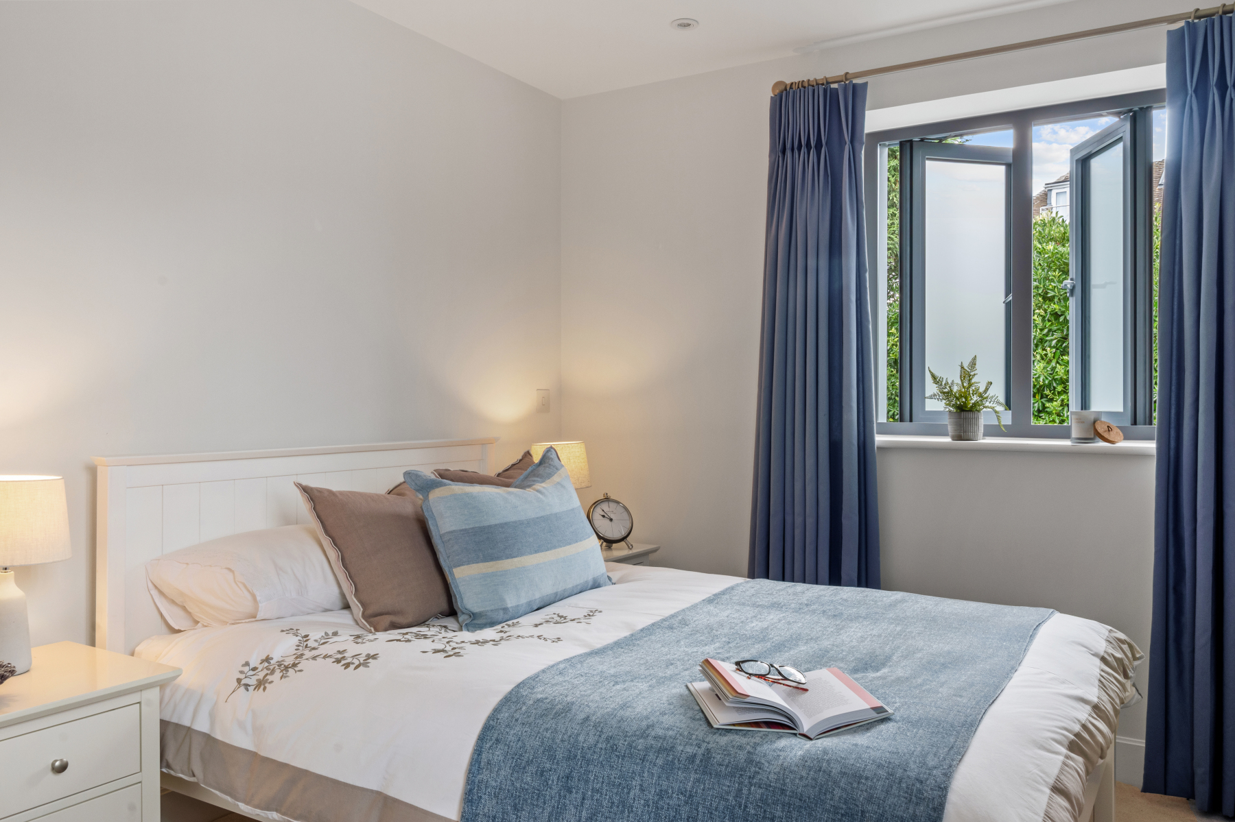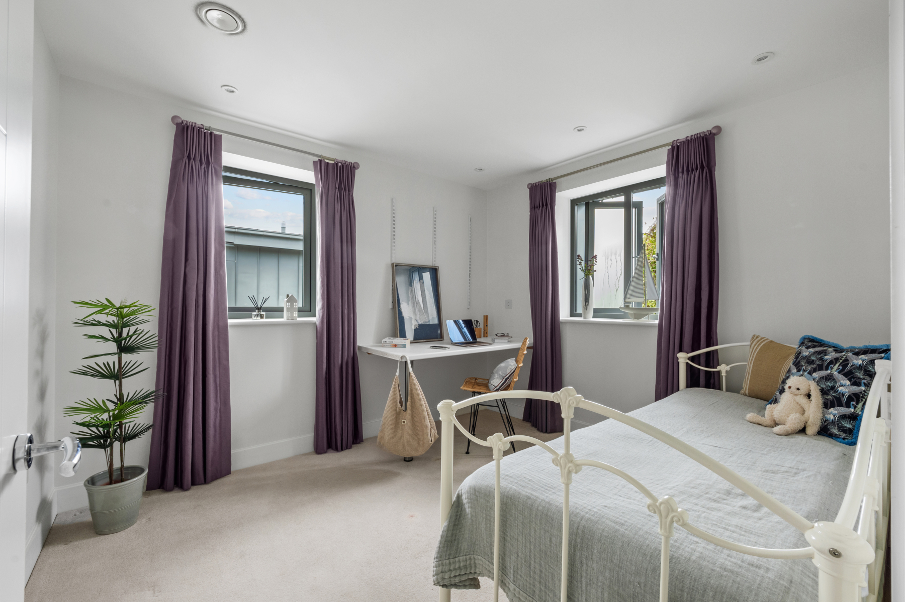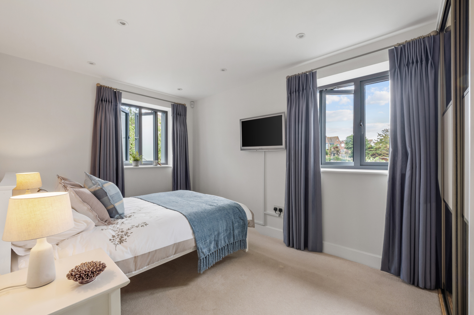 BEDROOM TWO is a generous dual aspect double with fitted wardrobe which in many homes would be considered the principal bedroom. It is positioned close to the FAMILY BATHROOM which is finished in a luxurious contemporary style and includes a bath. BEDROOM THREE, also dual aspect, has been used as a home office and benefits from excellent natural light and strong connectivity. If used as a third bedroom it can accommodate a double bed and is conveniently close to the GUEST CLOAKROOM, which is again spacious and beautifully styled. A separate storage cupboard houses the air circulation system with additional space for items such as ironing boards, vacuum cleaners or golf clubs.