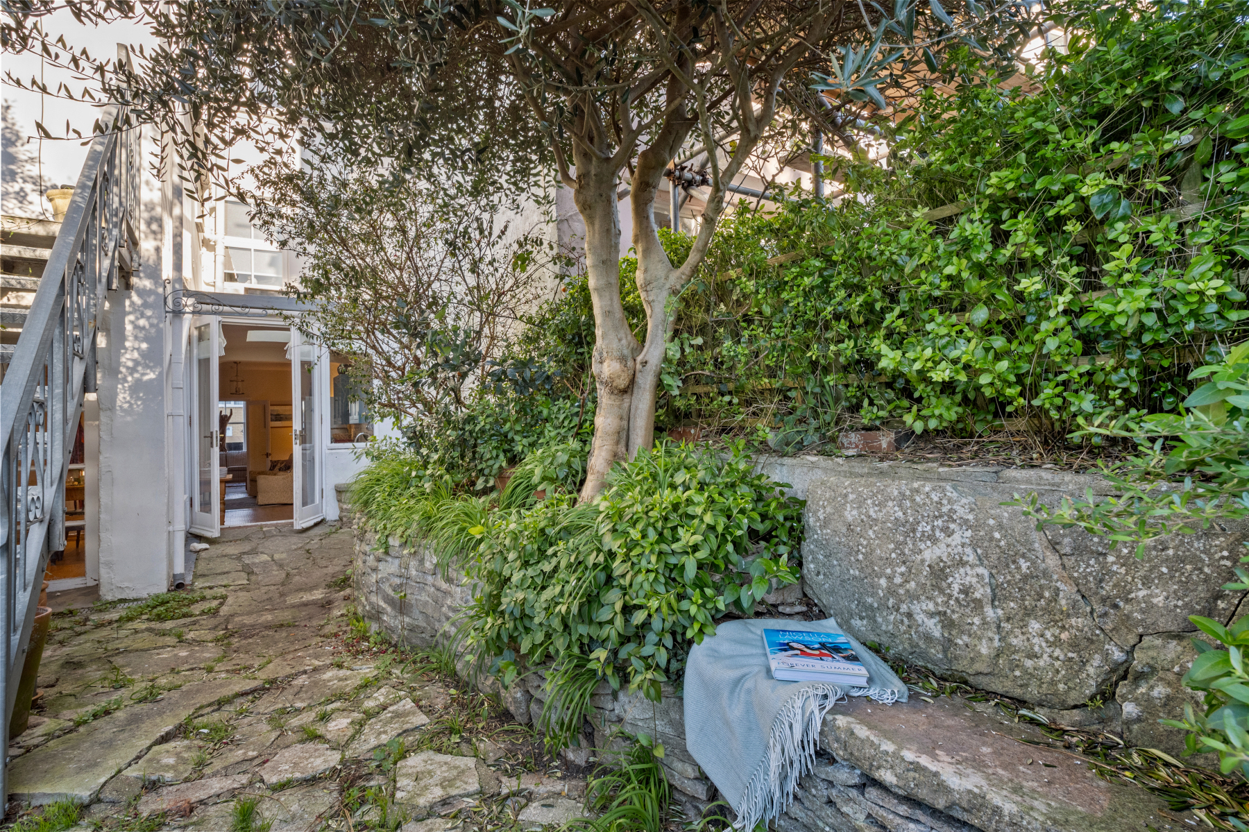 From the kitchen, double doors open to a romantic COURTYARD GARDEN, enclosed by Purbeck stone walls, integrated benches and scented with roses and jasmine. It captures the afternoon sun and is an ideal spot for alfresco dining. A charming gate leads out to a path that offers alternative access when returning from sandy days on the beach or muddy autumn walks. Stairs lead up to an ELEVATED TERRACE, which in turn connects to Bedroom Four, providing another space to enjoy drinks in sunshine, even in the winter months.