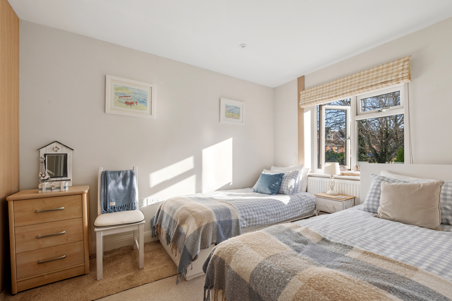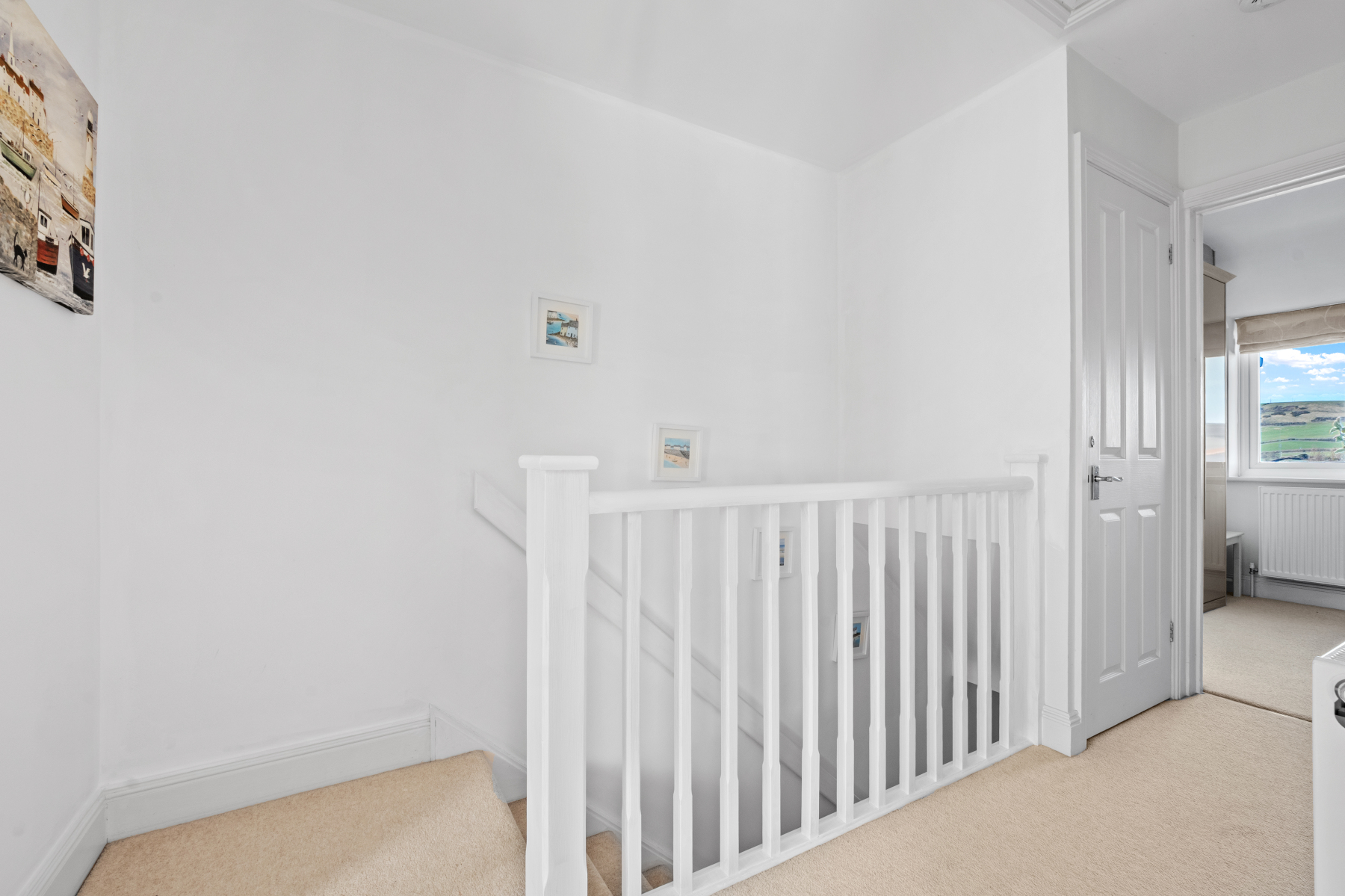 Stairs lead to a bright and spacious LANDING from which all other rooms can be accessed. The PRINCIPAL BEDROOM is a peaceful retreat with dual aspect windows looking out across rooftops towards Ballard Down and features an ensuite shower room. The SECOND DOUBLE BEDROOM, currently furnished as a twin room with a window overlooking the garden below, has wall to wall wardrobes and is located next to the FAMILY BATHROOM. The landing also has a roomy airing cupboard and potentially enough space to extend, subject to the necessary consents.