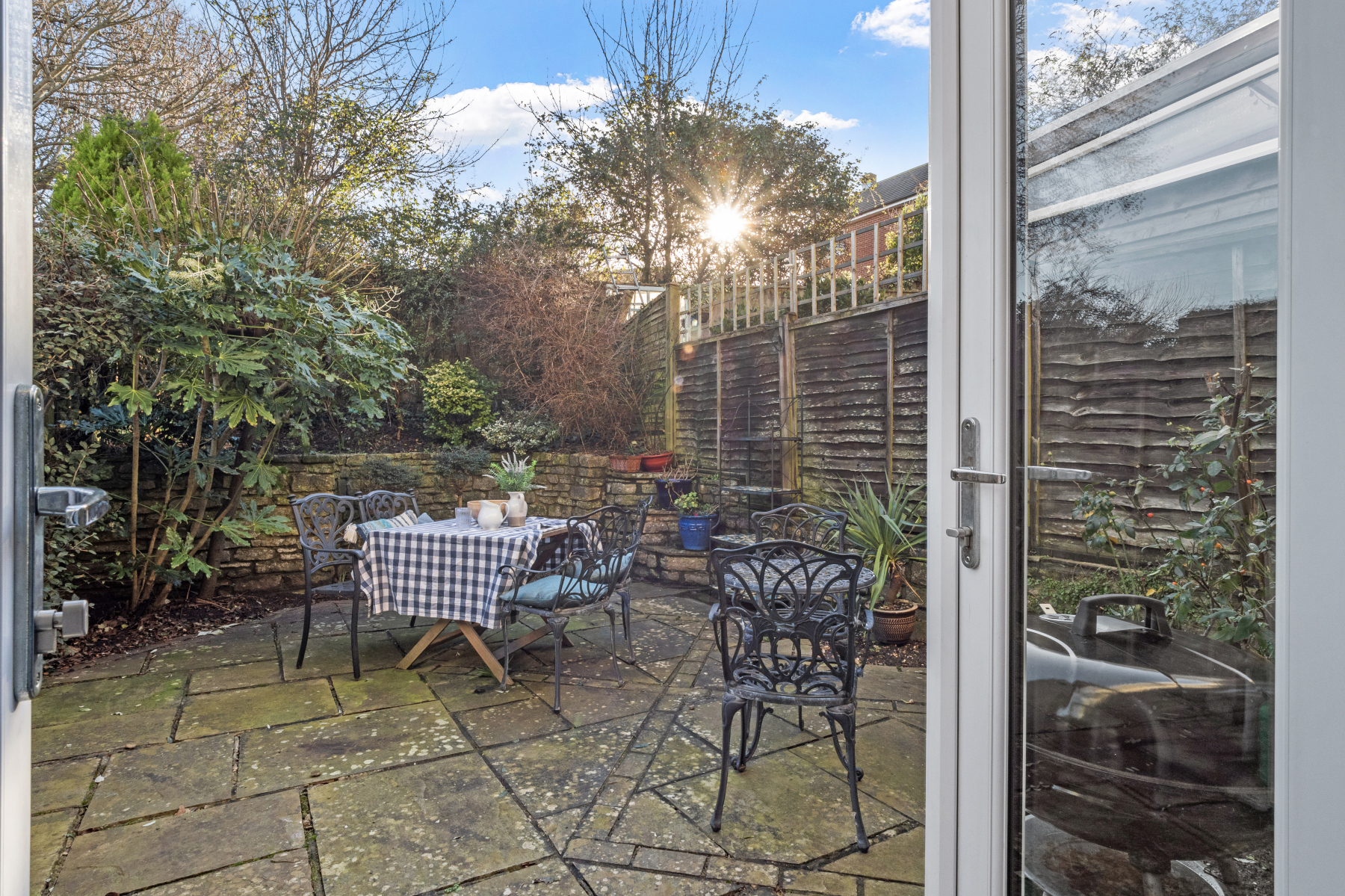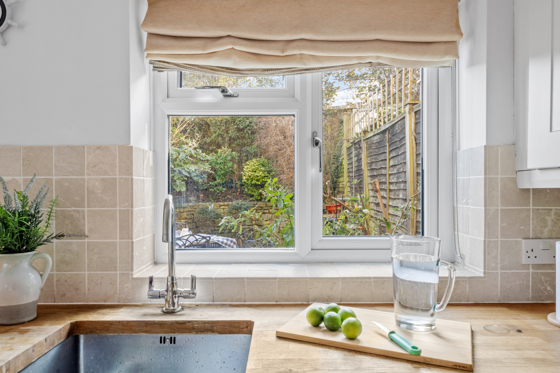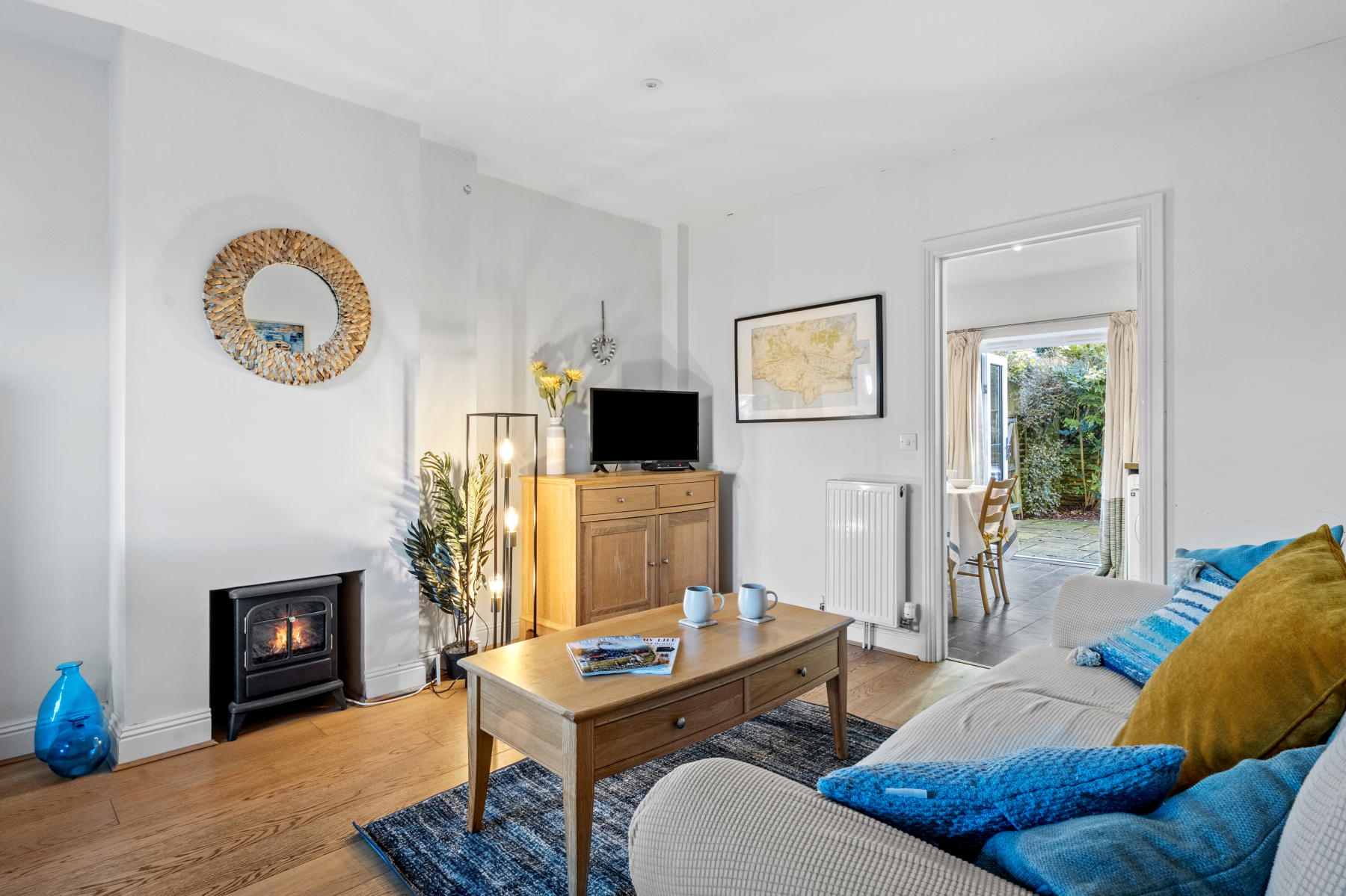 This leads into a generous SITTING ROOM with contemporary flooring running through and a fireplace, currently unused, but an ideal location for a log burner. There are windows out towards the front, but the eye is automatically drawn towards the private sunny garden, surrounded by established planting and drenched in sunlight. A large doorway opens into the KITCHEN/BREAKFAST ROOM, which in turn has double doors opening into the courtyard garden. Being south facing, the kitchen is flooded with natural light throughout the year. The well fitted kitchen includes an additional window above the sink, again looking out to the pretty garden. This light filled room has space for a breakfast table, although most meals tend to be served in the garden.