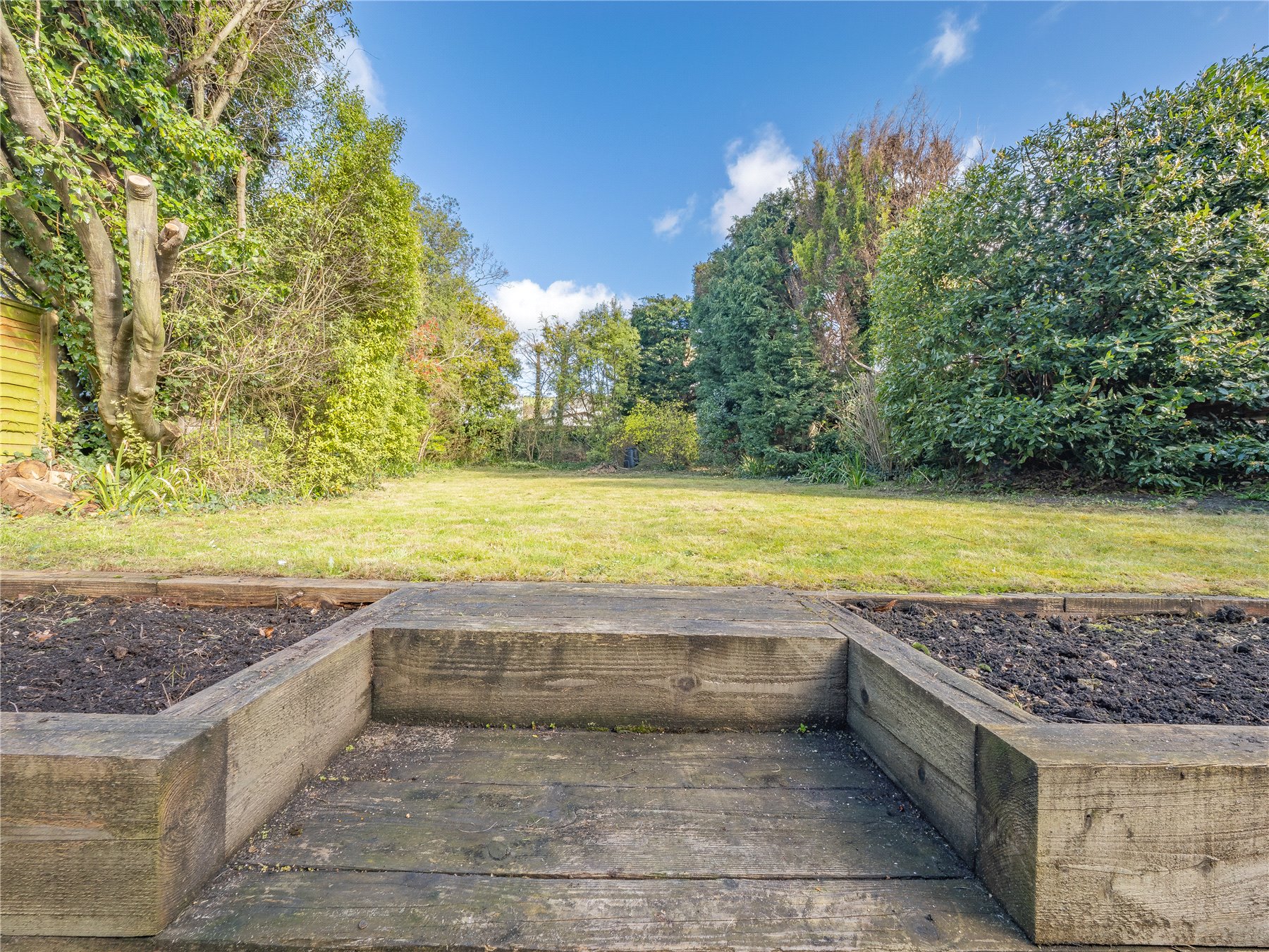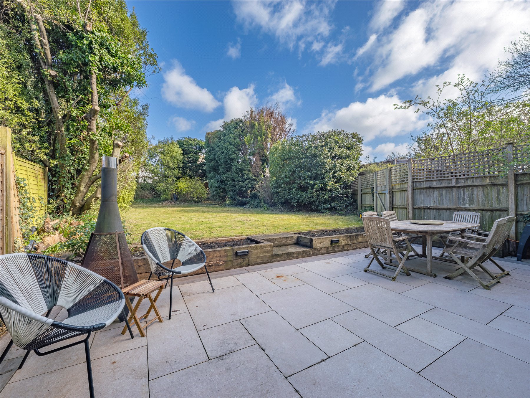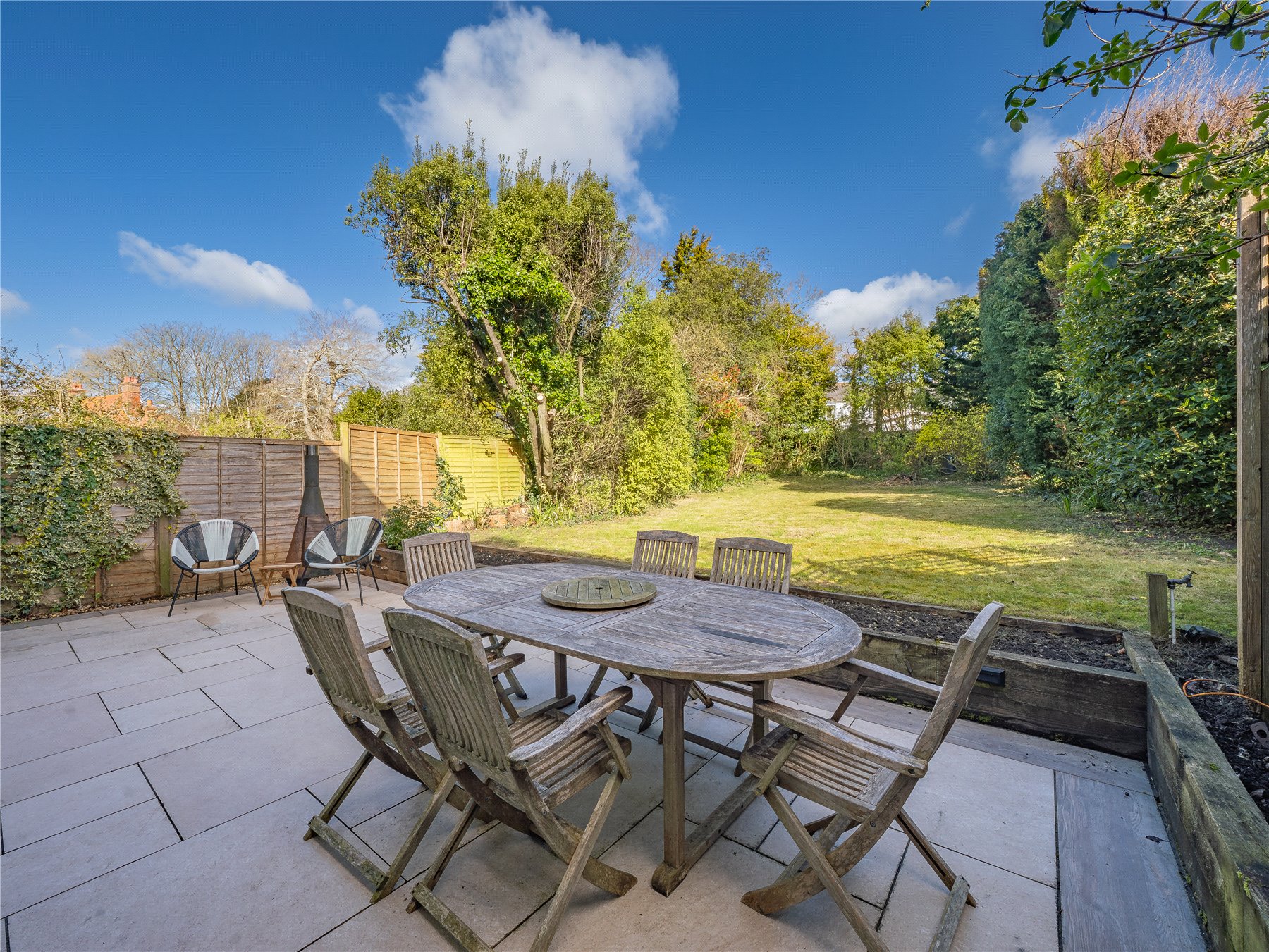 The rear garden is a true sanctuary, with a generous patio area perfect for hosting unforgettable gatherings. Raised sleeper borders elegantly define the patio from the expansive lawn, which stretches out and is framed by mature bushes and trees, offering unparalleled privacy and seclusion. The lush greenery, including Tawhiwhi, Bay Laurel, and Spindle trees, creates a serene and evergreen backdrop. On a practical note, the Grant boiler is discreetly positioned, alongside a log store, in the impressive 100ft garden.