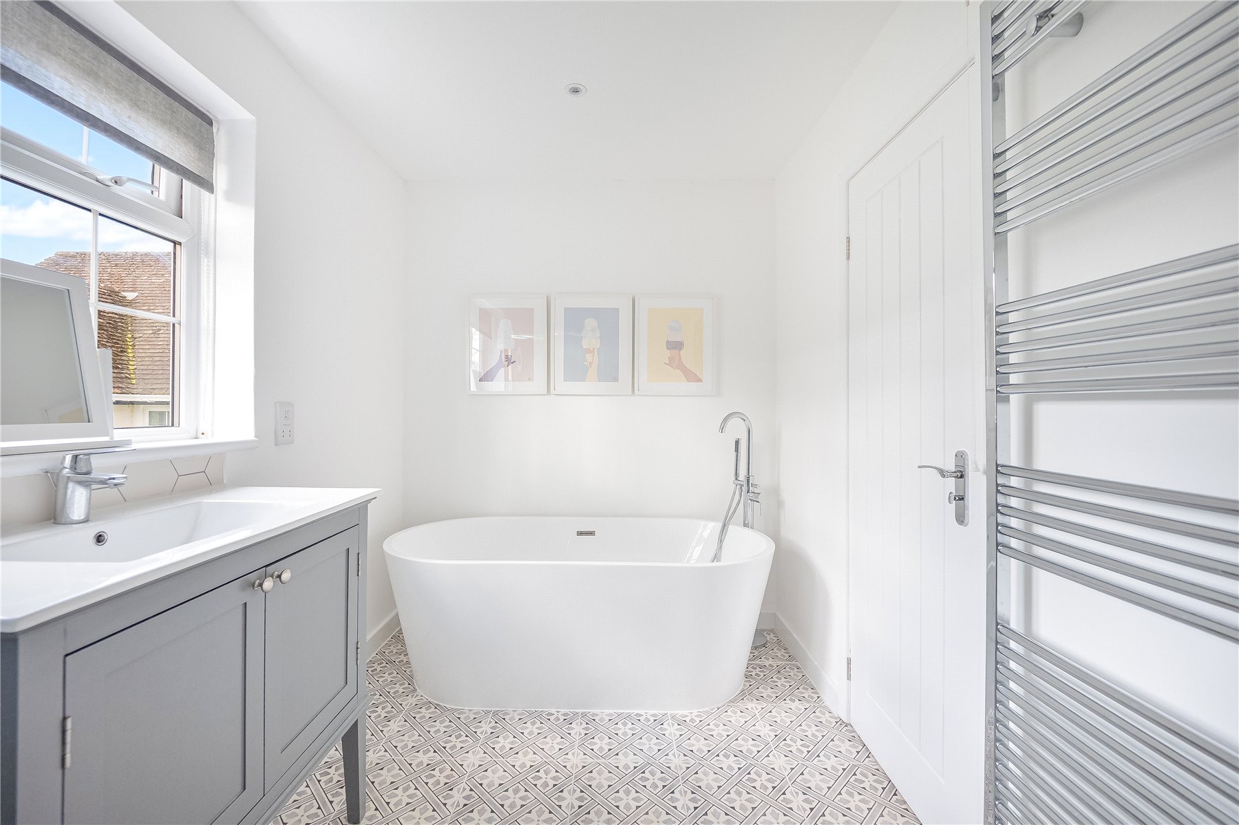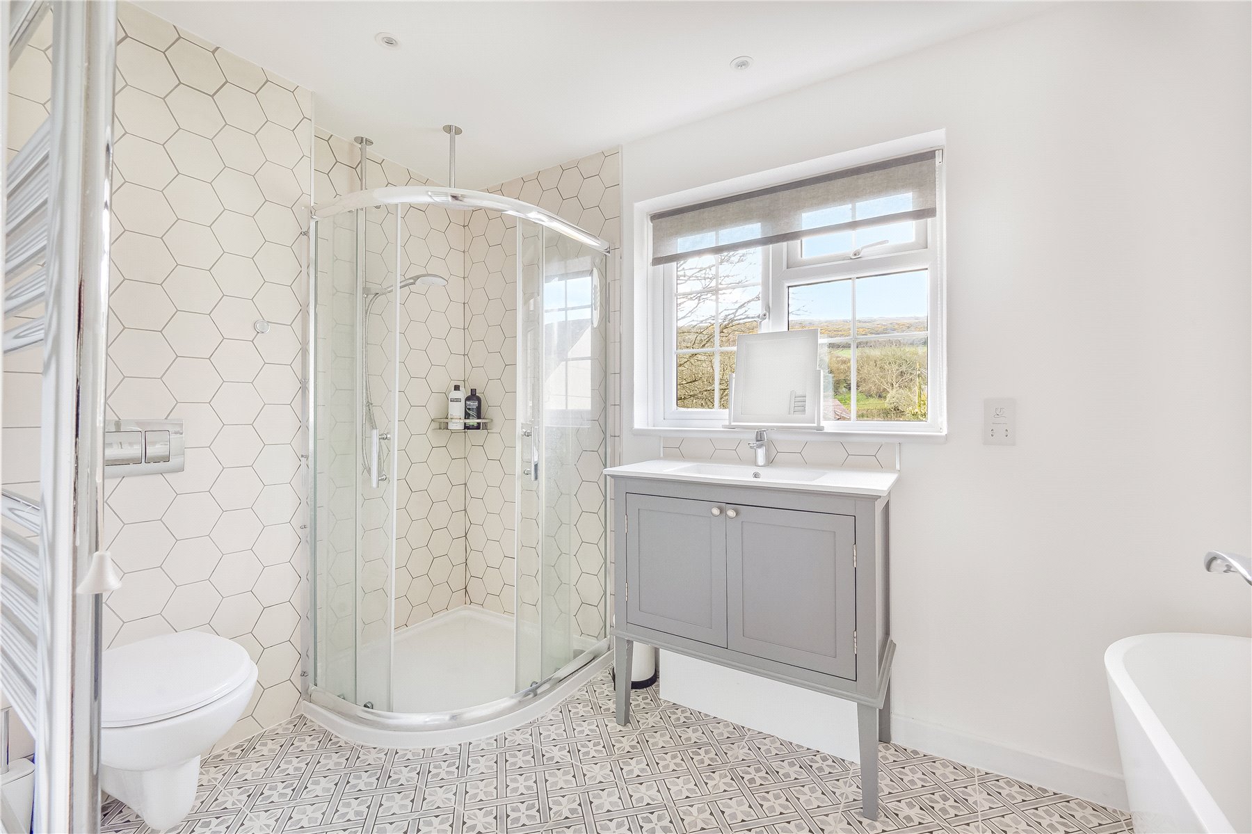 The upper level continues to captivate with its elegantly designed BATHROOM and SHOWER ROOM . Indulge in the luxury of a rolled-top bath, complete with a swan neck tap and hand shower, or enjoy the convenience of a fully enclosed shower cubicle. A sleek vanity unit with wash hand basin, a concealed cistern WC, and a heated towel rail enhance the space, transforming it into a spa-like retreat.