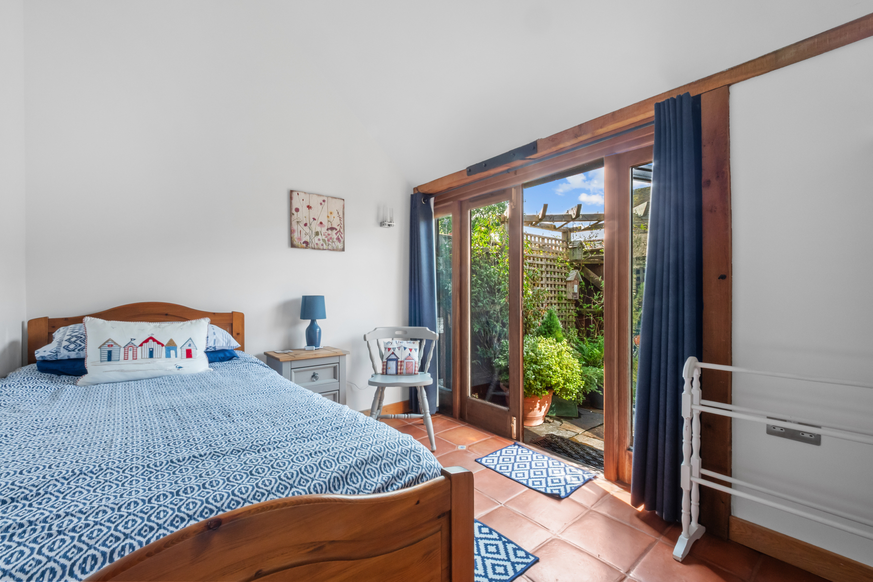 Solid iroko and glass doors from every room lead onto a private south facing patio which runs the length of the cottage. This is a delightful space, which has been thoughtfully planted out and designed to capture the last rays of sunshine, with a sun downer! To the front of the cottage are recesses which can offer off-road parking for 2 cars. Access through a side gate leads to the private, fenced patio.