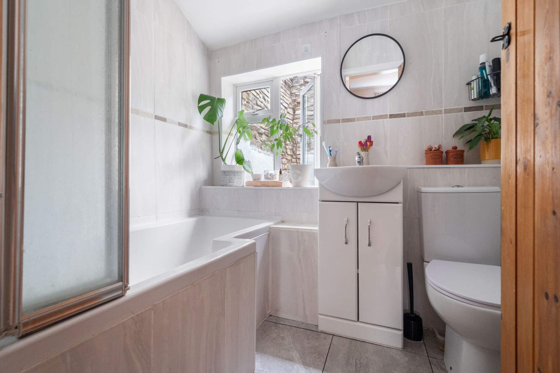 A step up from the sitting room takes you into the light, contemporary BATHROOM, with a wide bath with shower over, W.C., and wash basin set within a fitted unit.