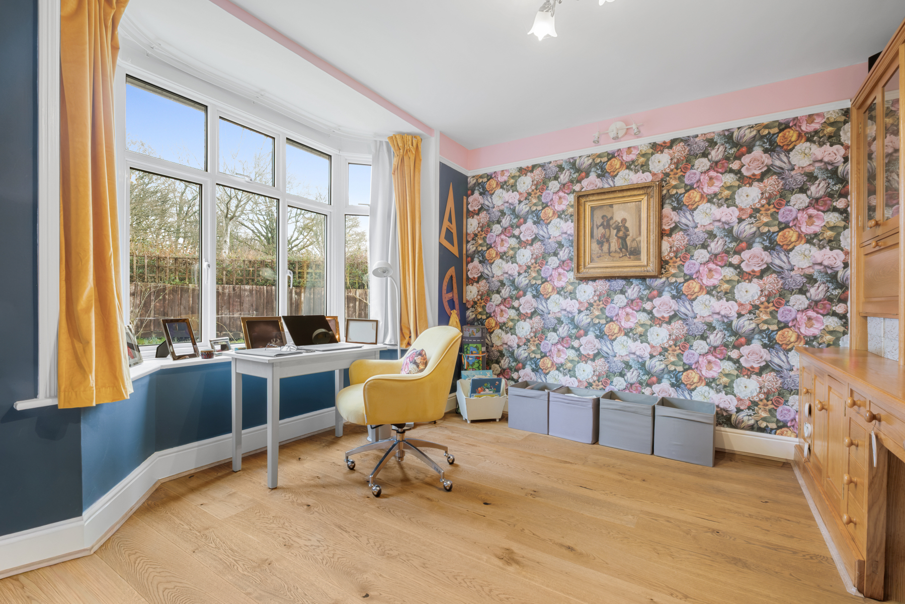From here, a delightful RECEPTION ROOM, currently arranged as a study, features a charming bay window overlooking the rose beds, attractive built-in open shelving with glazed cupboard doors, and wood flooring. This versatile space would equally make a wonderful formal DINING ROOM.