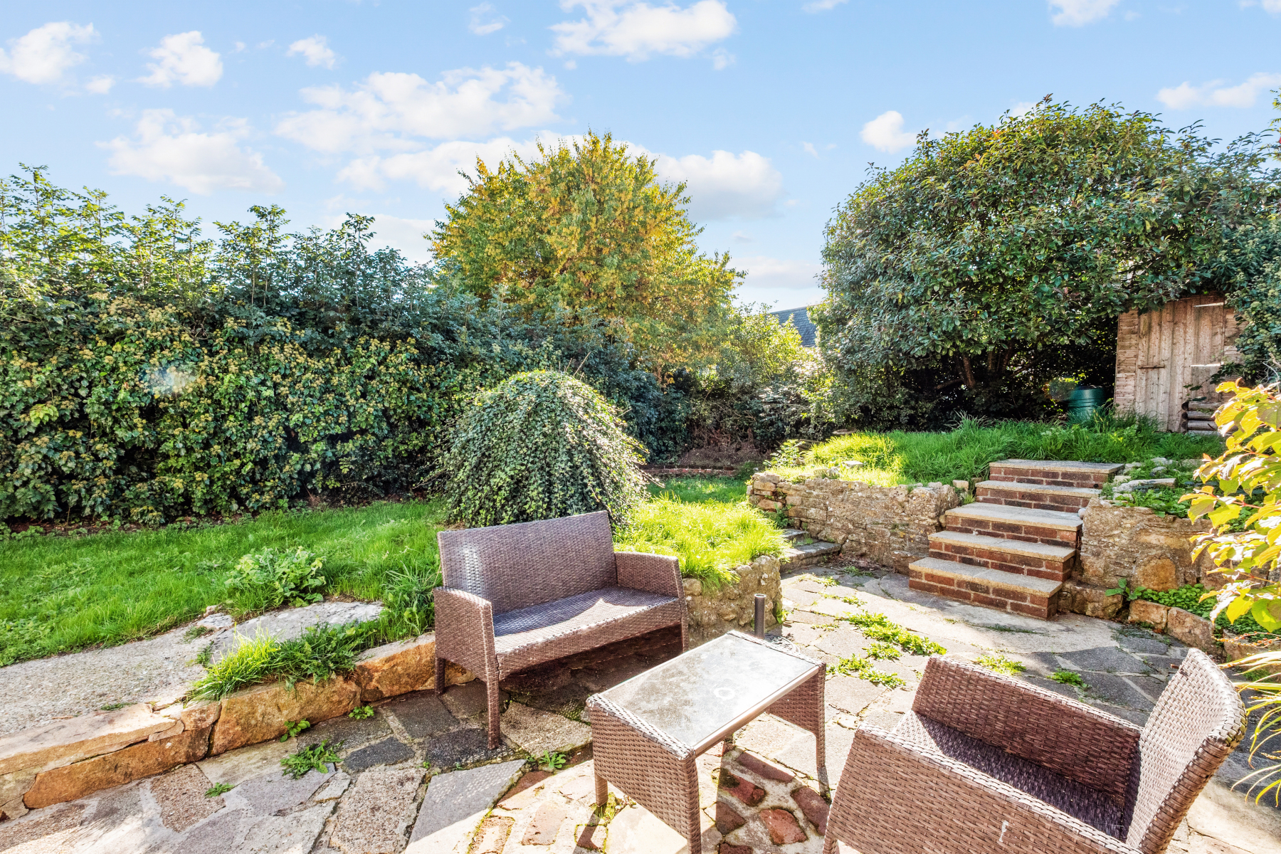 The garden has a natural informal feel, with areas of planting, a small pond, and an additional seating area. Steps rise to a further area of lawn, where a second garden shed provides useful storage. Altogether, the grounds offer a peaceful setting, well suited to both entertaining and quiet enjoyment.