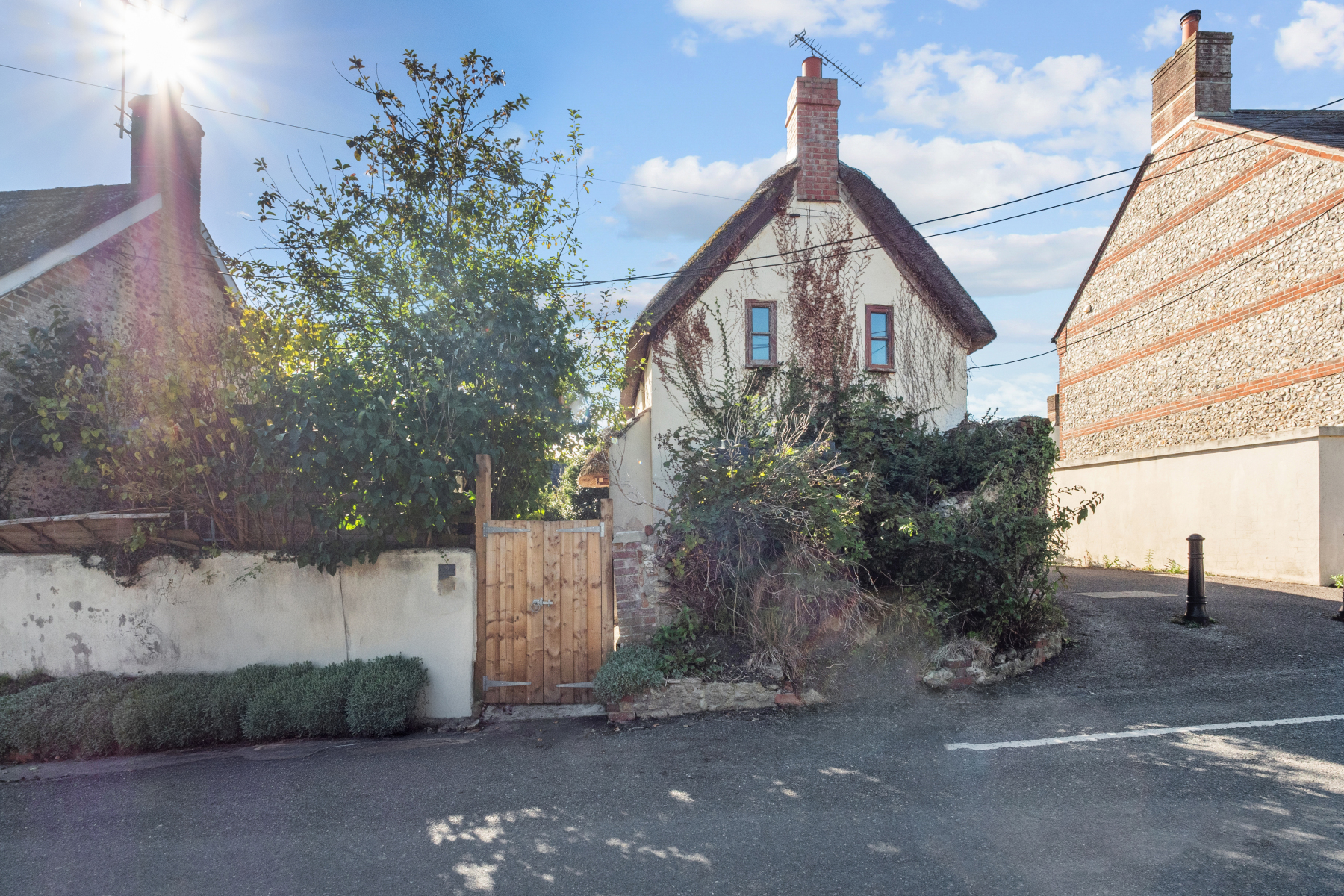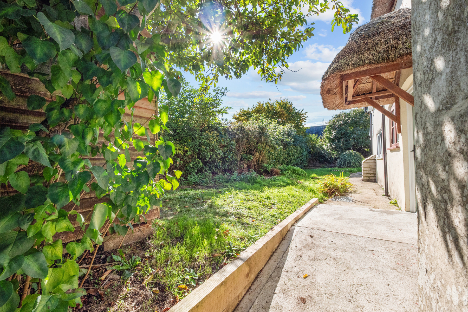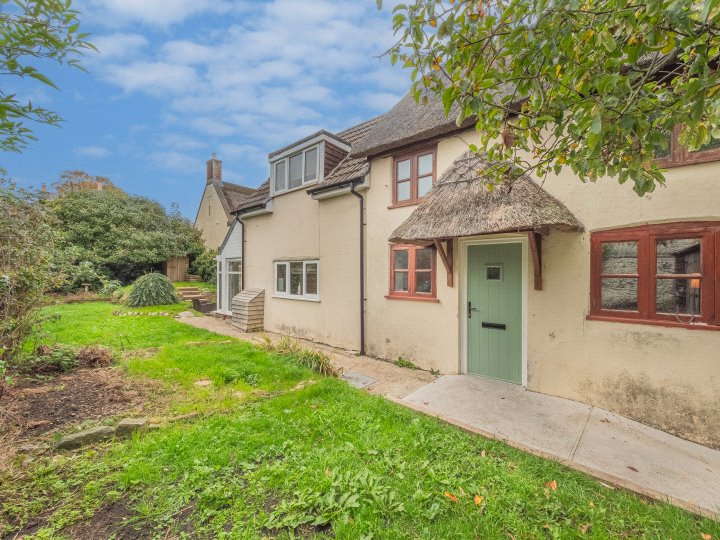 Iris Cottage is approached through a timber gate, with a garden shed to the side and a pathway leading to the thatched entrance canopy and front door. The gardens are mainly laid to lawn and enjoy a desirable south-westerly aspect, offering a good degree of privacy and afternoon sun. A generous paved terrace abuts the rear of the house, creating an inviting space for outdoor dining and relaxation.