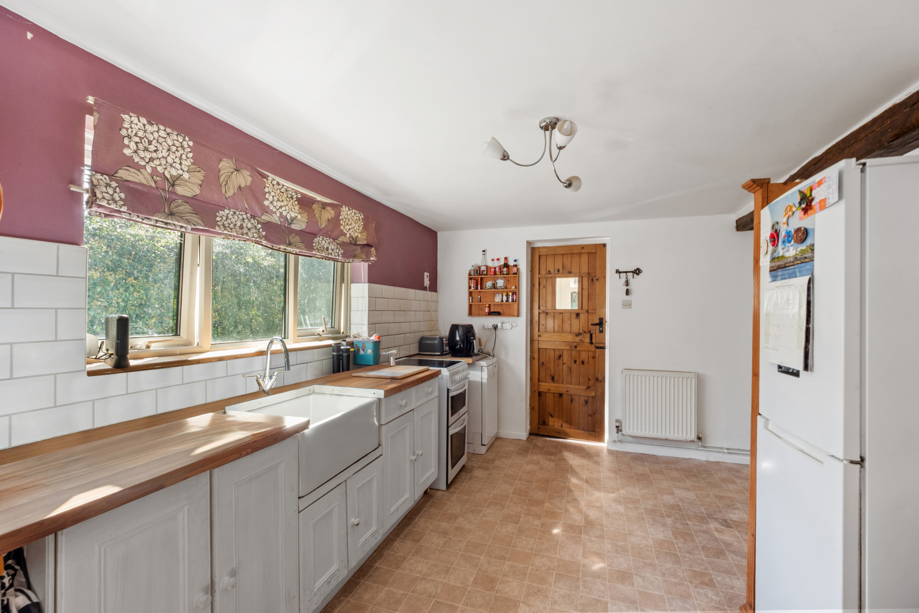 The KITCHEN/DINING ROOM is fitted with floor-mounted units and worksurfaces, with an inset Butler sink positioned beneath the window, providing plenty of natural light and a pleasant outlook. There is space for an oven (supplied by bottled gas), together with further space for a washing machine and fridge/freezer. The room is large enough to accommodate a dining table and chairs, making it a practical and sociable hub of the home. Further features include a useful walk-in larder and an under-stairs cupboard housing the oil-fired condensing boiler. A stable door opens into the SUN ROOM laid with attractive tiled flooring and providing access to a separate store cupboard. From here, a further door opens directly onto the paved patio and garden beyond.