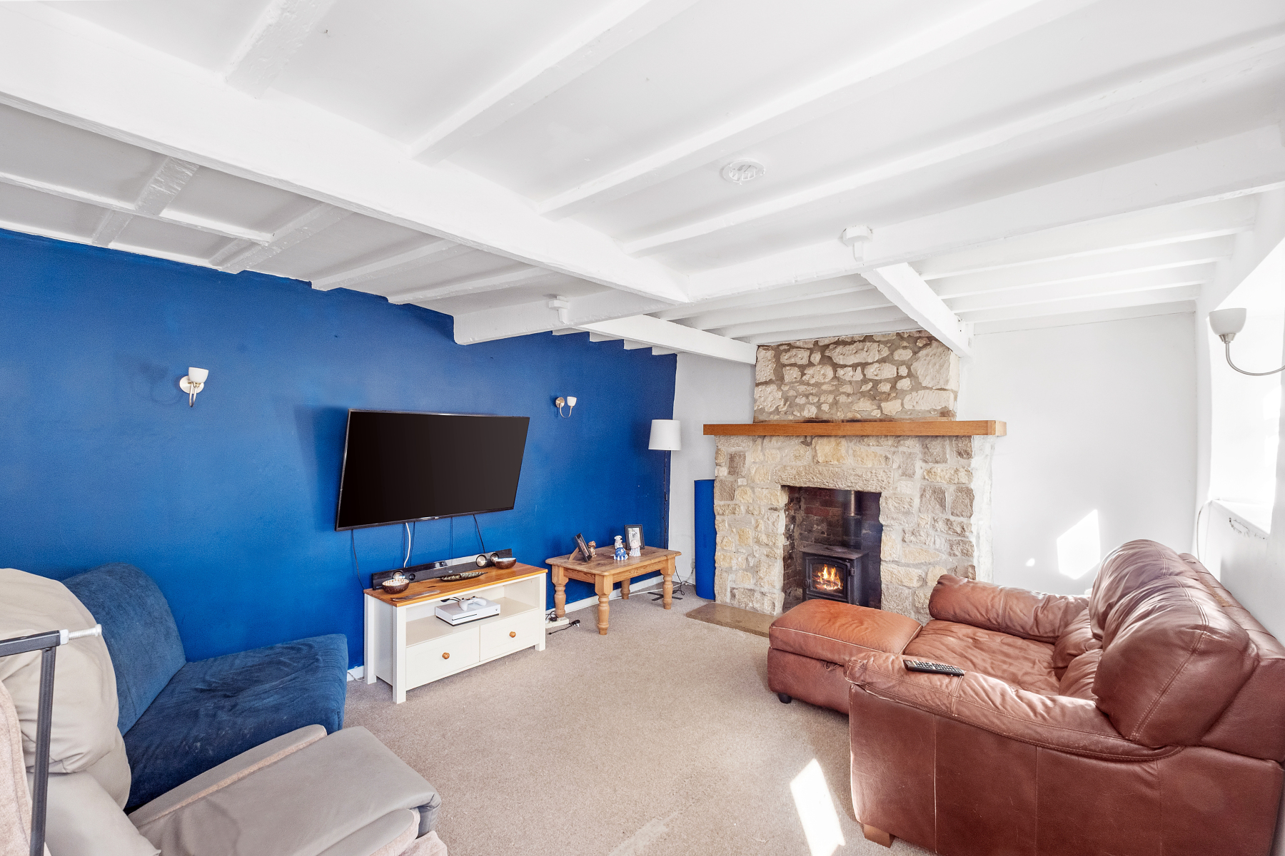 The thatched entrance canopy opens into the SITTING ROOM, an inviting space where the front door is flanked by windows overlooking the gardens. This welcoming room is centred around a stone fireplace with timber mantel, brick and flagstone hearth with inset woodburning stove. Exposed ceiling beams add to the character, creating a space well suited for both everyday living and relaxing by the fire.