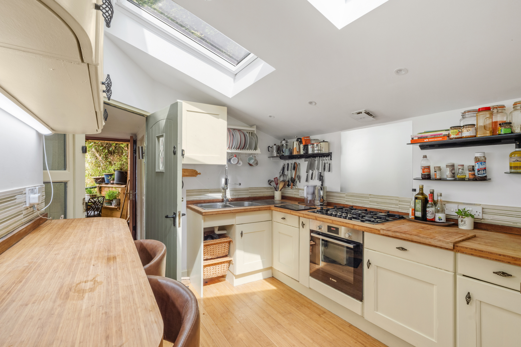 A covered PORCH opens into a welcoming ENTRANCE HALL giving access to the main reception rooms. The SITTING ROOM is centred around the brick fire surround with pleasing Dunsley multifuel stove that also augments the heating. Timber beams and shuttered window add to the appeal of this room, while the DINING ROOM, with further beams is flooded with natural light courtesy of the Velux window and has a useful built-in storage cupboard. Adjacent to the dining area is a versatile additional room, currently utilised as BEDROOM THREE, ideal as a single room study or guest space. Discreetly positioned is the CLOAKROOM with vanity unit with countertop wash hand basin, WC. The KITCHEN has a range of units with timber work surfaces and fitted breakfast bar, twin Velux windows ensure plentiful light. Integral appliances include 4 burner hob (LPG), electric oven and a fridge/freezer. Venturing through the kitchen is the side entrance hall and doors to the integral garage, and the small utility area and store. A further door leads outside and to the garden.