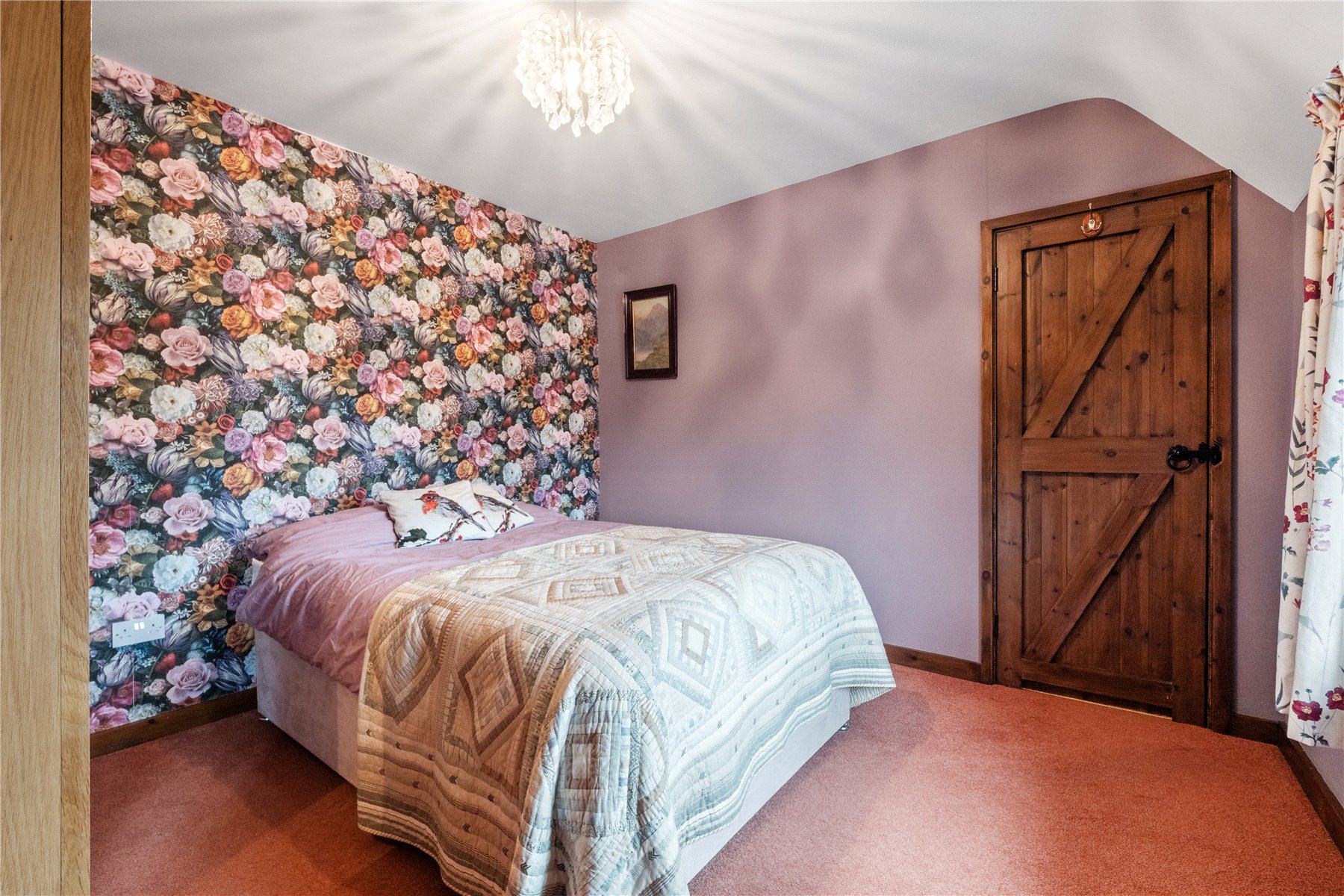 Stairs rise to the first floor, where the generous landing presents a layout that works well for both family life and visiting guests. The PRINCIPAL BEDROOM is a generous double room with plenty of space for freestanding furniture and sits at the front of the house, enjoying views across the valley. BEDROOM TWO shares this outlook and similar proportions, making it another spacious double room. BEDROOM THREE, positioned to the rear, is also a double and benefits from an adjoining eaves area with a Velux window. This room offers flexibility as a guest bedroom, study area, or hobby room.