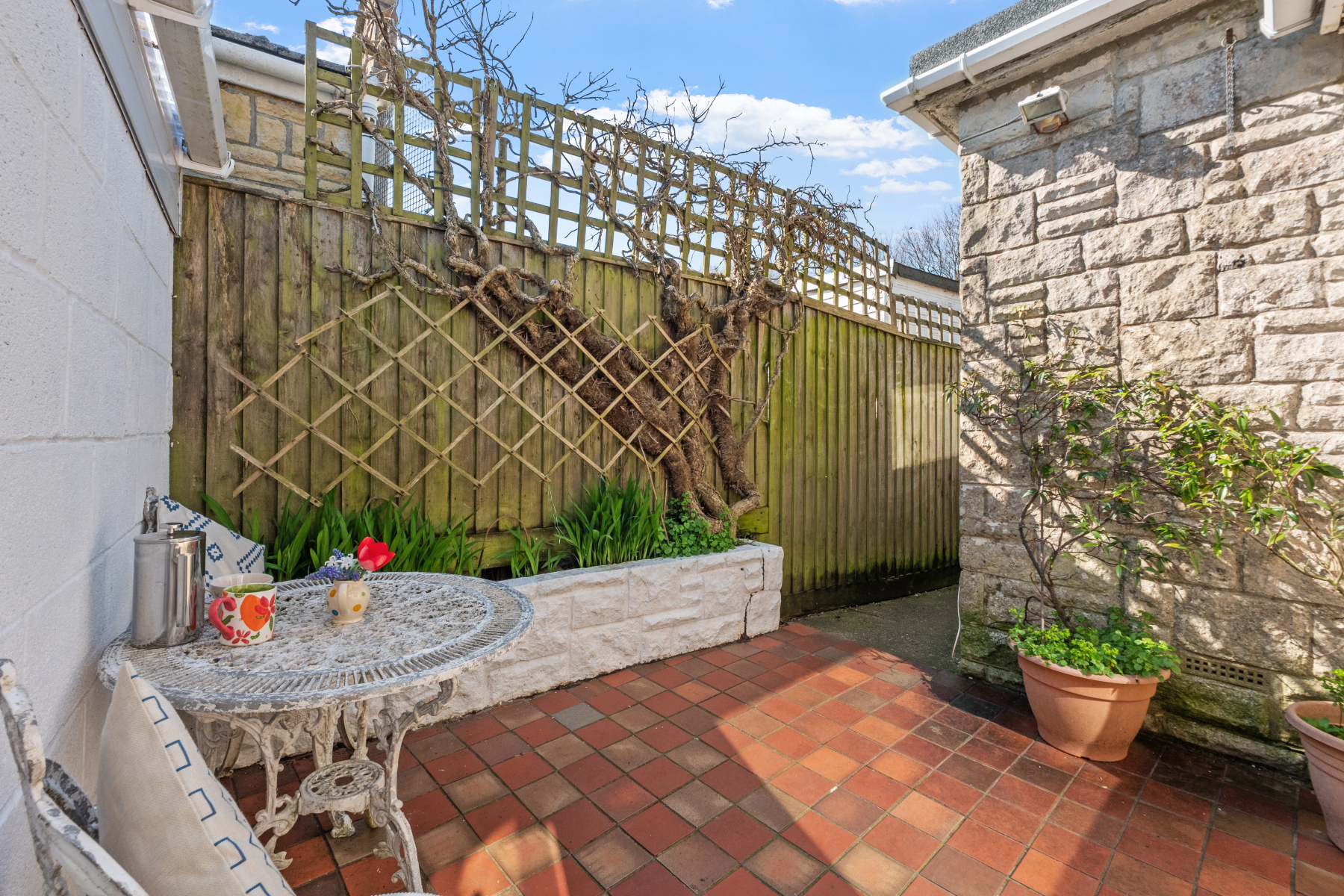 To one side, a tucked away courtyard, laid with tiles and accessed directly from the principal bedroom, offers a sheltered spot for a table and chairs, perfect for a morning coffee. The front garden is well screened by established shrubs, trees and hedging, providing a good degree of privacy from the road.