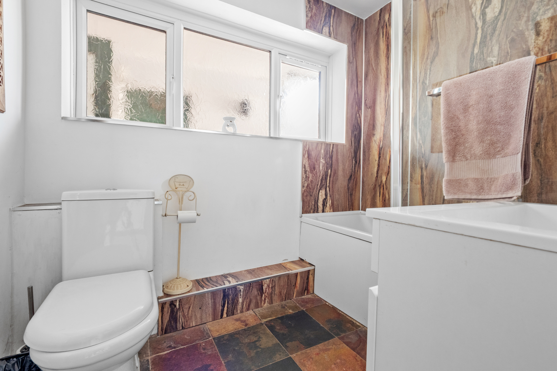 The FAMILY BATHROOM is fitted with a P-shaped bath with shower over, a wash hand basin set within a vanity unit and a W.C., providing a practical and well-arranged space.