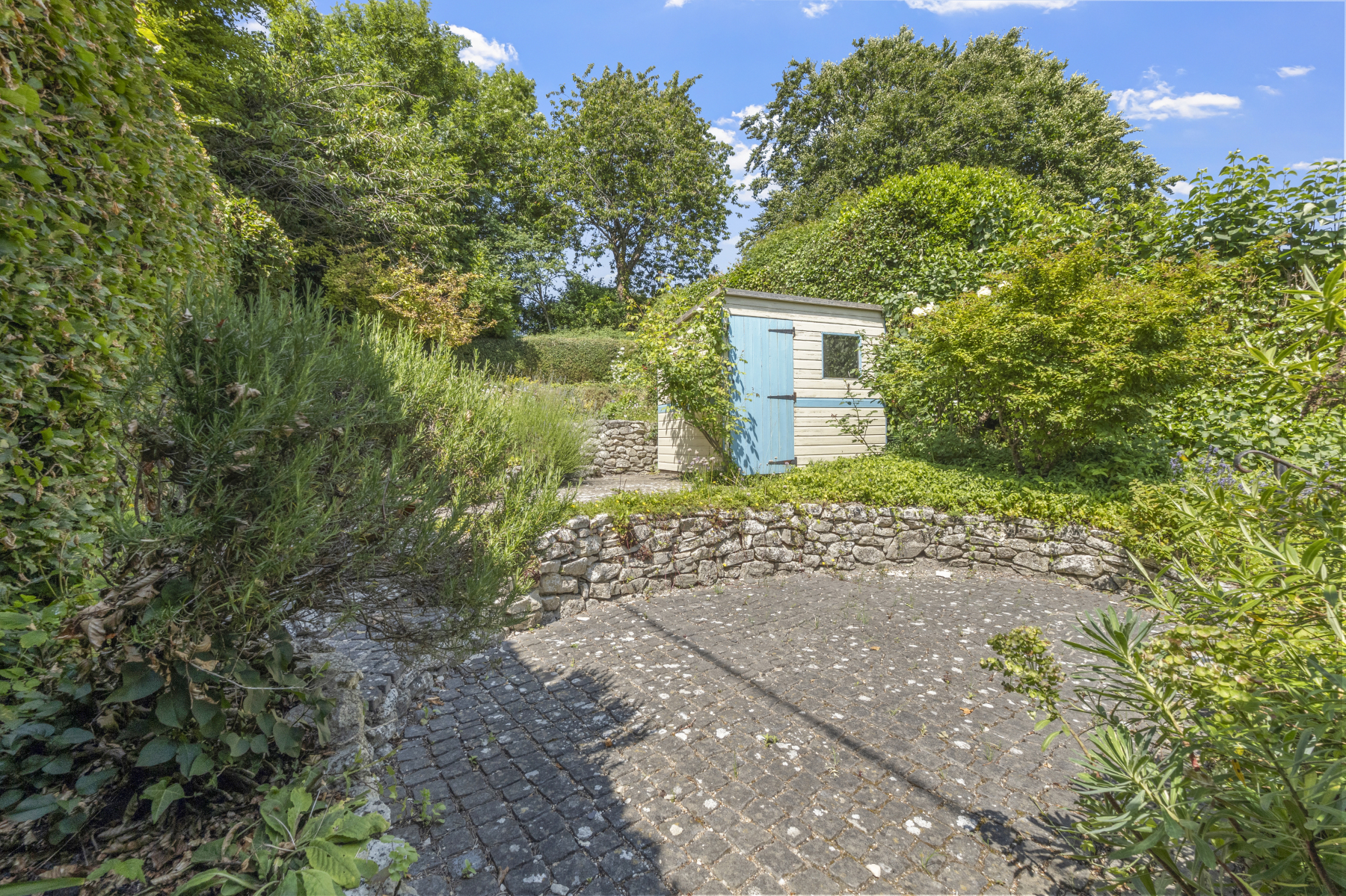 To the rear, the garden unfolds across a series of levels, thoughtfully landscaped to create a sense of discovery and seclusion. At the top, a raised lawn and patio area offer a peaceful vantage point from which to take in far-reaching views across the Bride Valley a truly special setting for reading, relaxing, or simply soaking up the natural beauty. Surrounded by mature planting, the garden feels wonderfully private, with a garden shed available for practical storage.