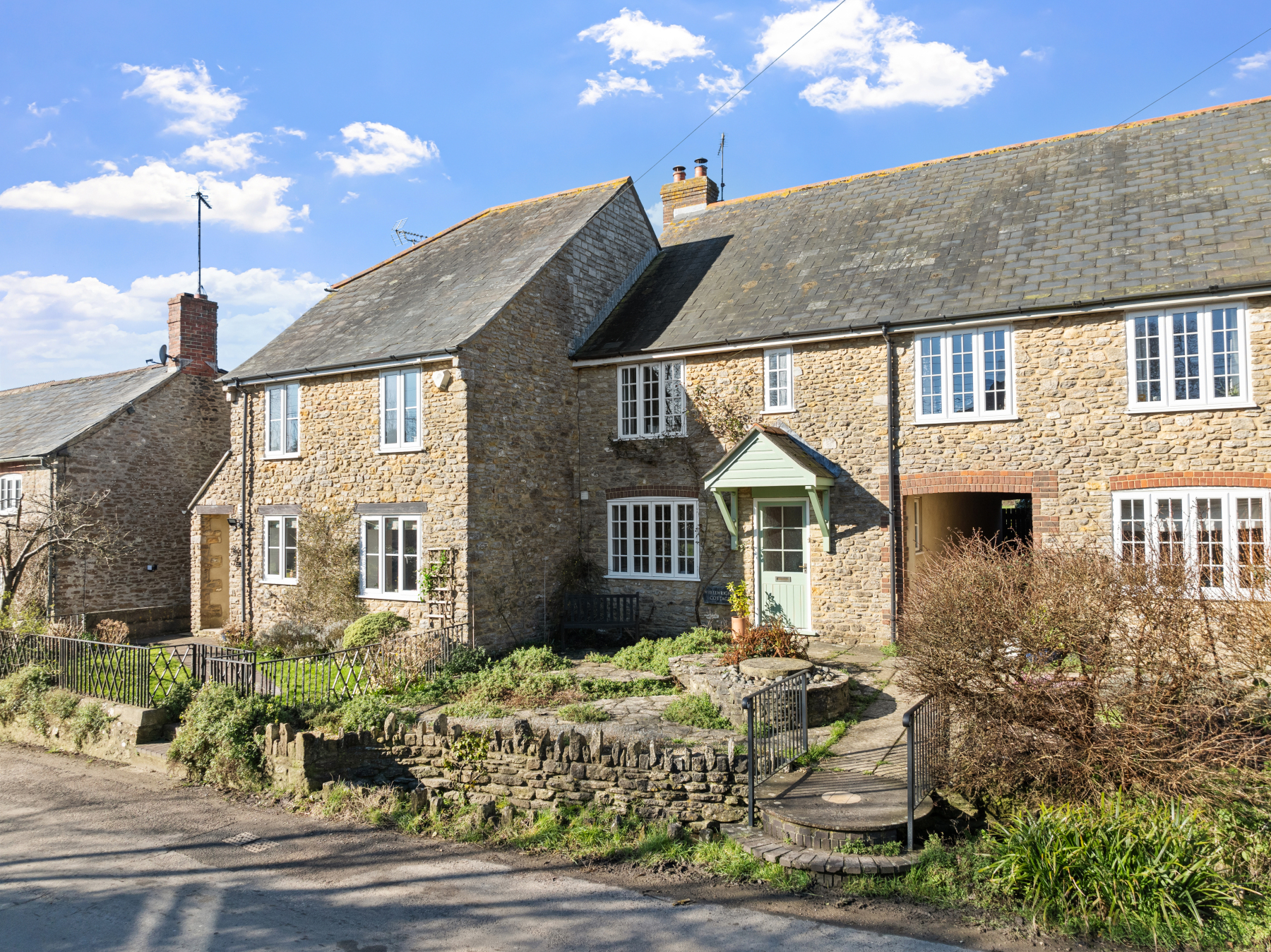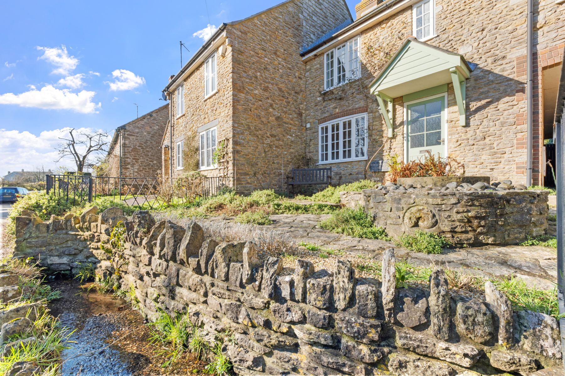 The cottage is set back from the quiet village lane, the front boundary adjoins a pleasant brook with small footbridge over. The FRONT GARDEN is arranged for ease of maintenance with pleasing stonework and paving.