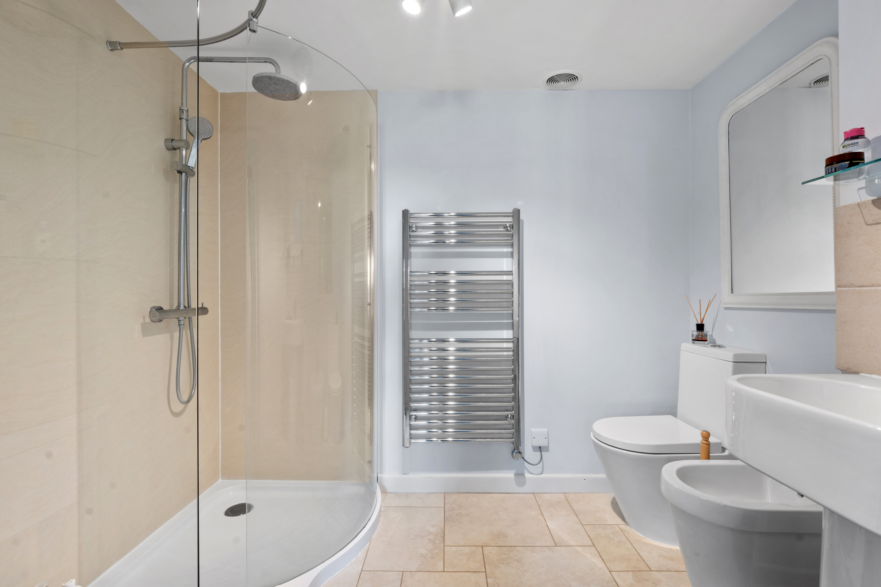 Venturing upstairs: the PRINCIPAL BEDROOM overlooks the rear garden and has an expanse of built-in wardrobes the length of one wall, this comfortable retreat also benefits from an ENSUITE, comprising shower cubicle with rainfall and hand shower attachments, pedestal wash basin, heated towel rail, bidet and W.C. The two remaining bedrooms BEDROOM TWO & BEDROOM THREE are also comfortable double bedrooms. Concluding the well-presented accommodation is the second BATHROOM which comprises panelled bath, pedestal wash basin, heated towel rail and W.C.