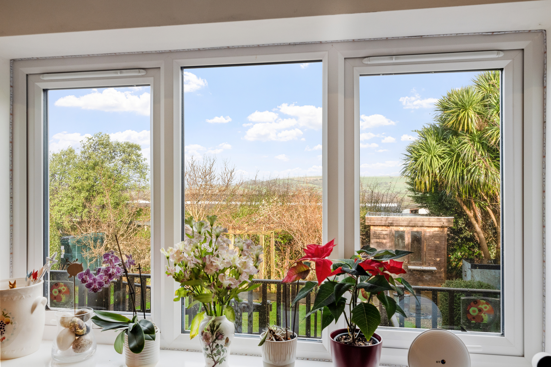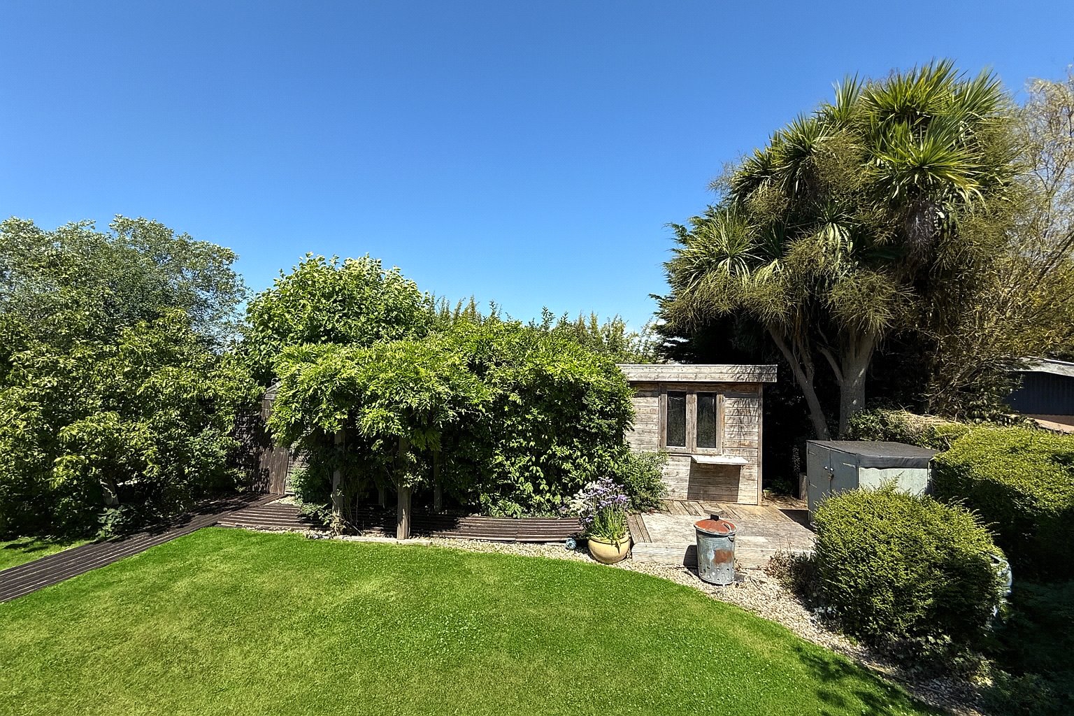 The rear garden is a private sanctuary, offering far-reaching views over the Bride Valley. This much-loved garden is a haven for wildlife, featuring a good-sized lawn, flower and shrub beds, and mature trees such as magnolia, palm, apple, pear, and crab apple. Additional highlights include fruit bushes, a wisteria and rose-clad arbour, a garden shed, and a timber workshop/summerhouse.