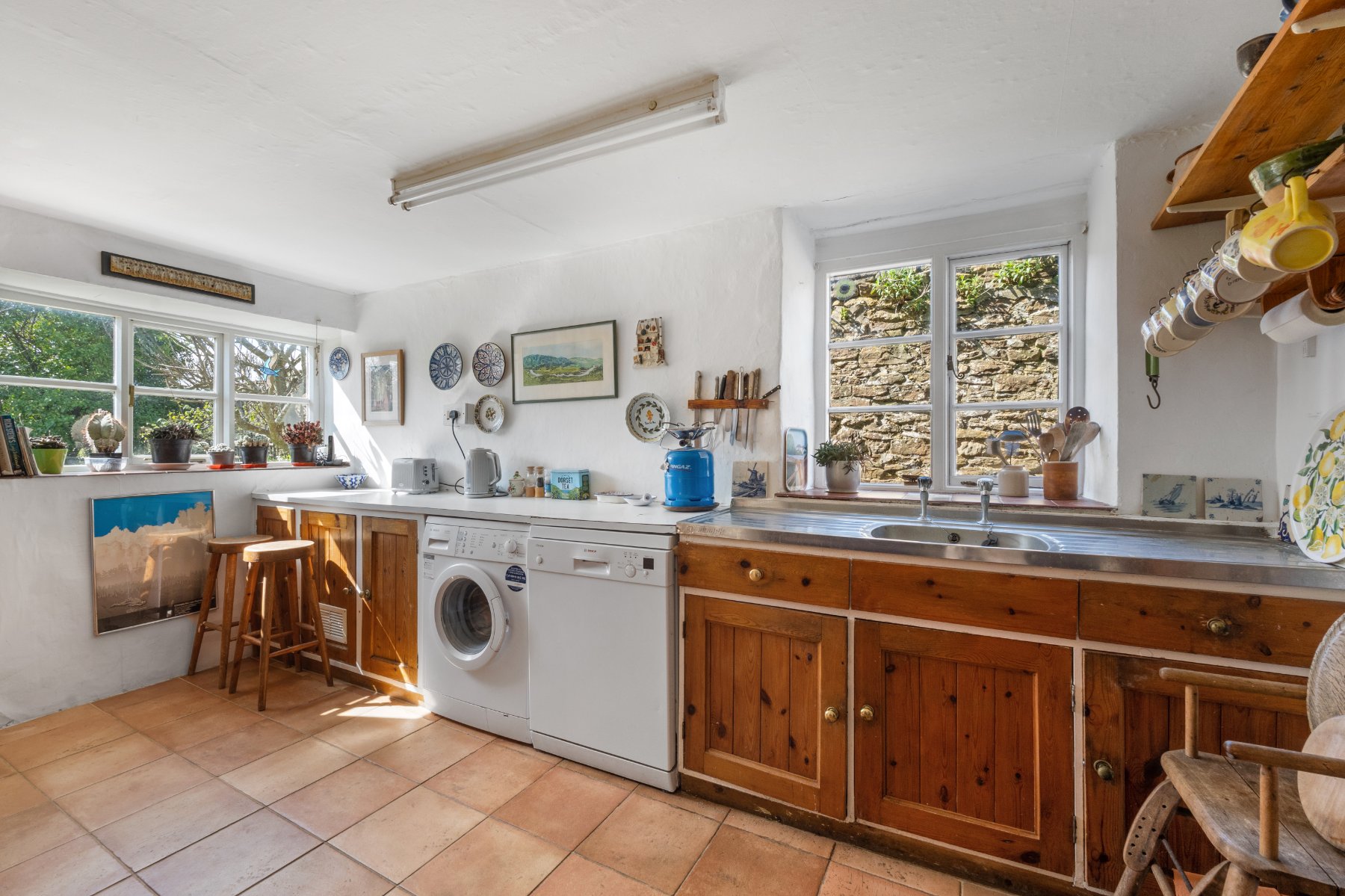 The KITCHEN is a warm and welcoming space, fitted with practical units, with space and plumbing for a washing machine and dishwasher. There is a newly installed Heritage cooker - of classic AGA style - that runs all the heating and cooking. A secondary staircase leads to the first floor.