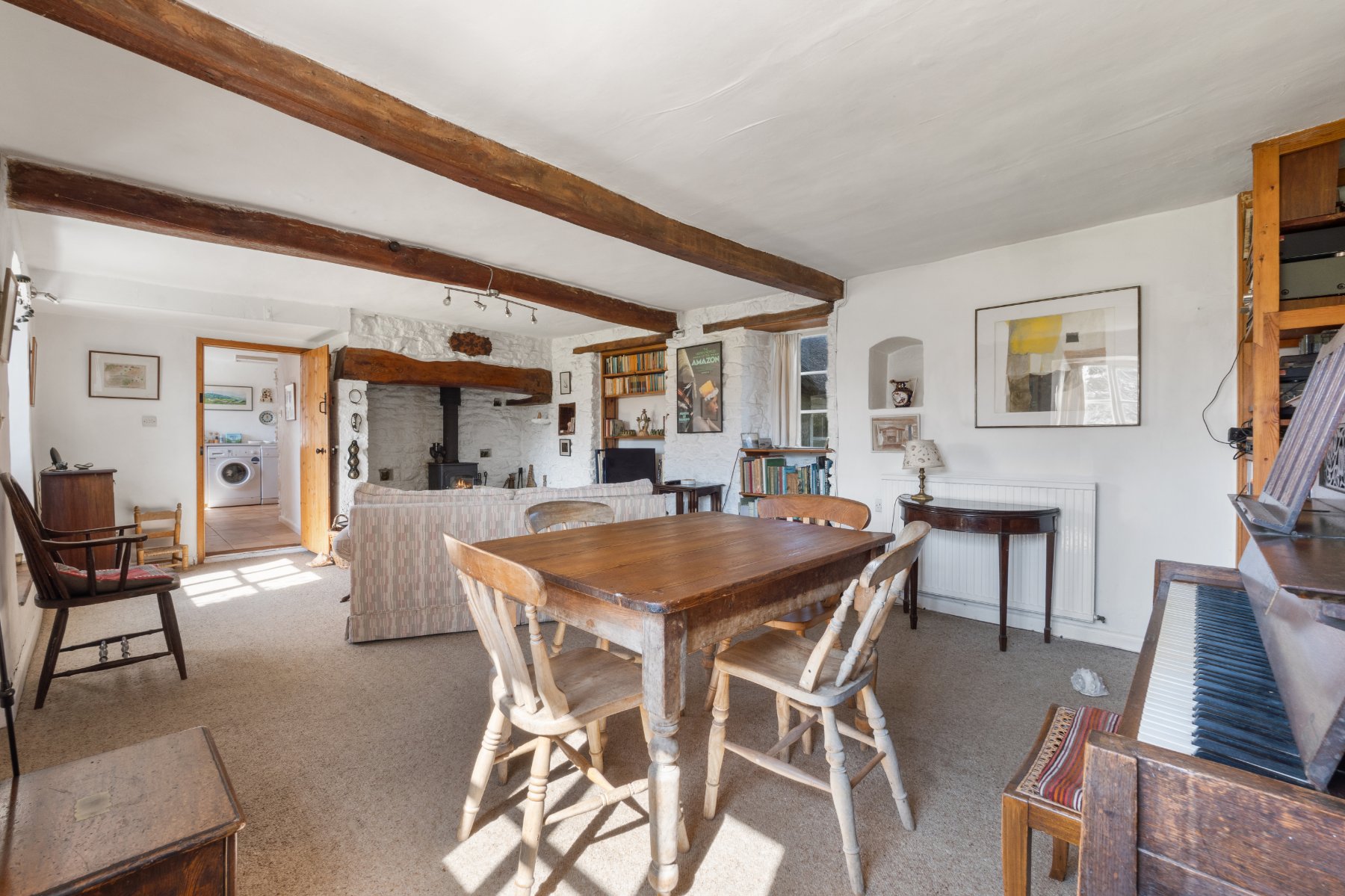 The SITTING/DINING ROOM is generous and full of atmosphere; centred around a large inglenook fireplace with a wood-burning stove perfect for quiet winter evenings by the fire. A door leads from here to the STUDY, ideal for home working featuring a charming cast iron stove and French doors which open to the garden. Stairs lead from the study to the first floor.