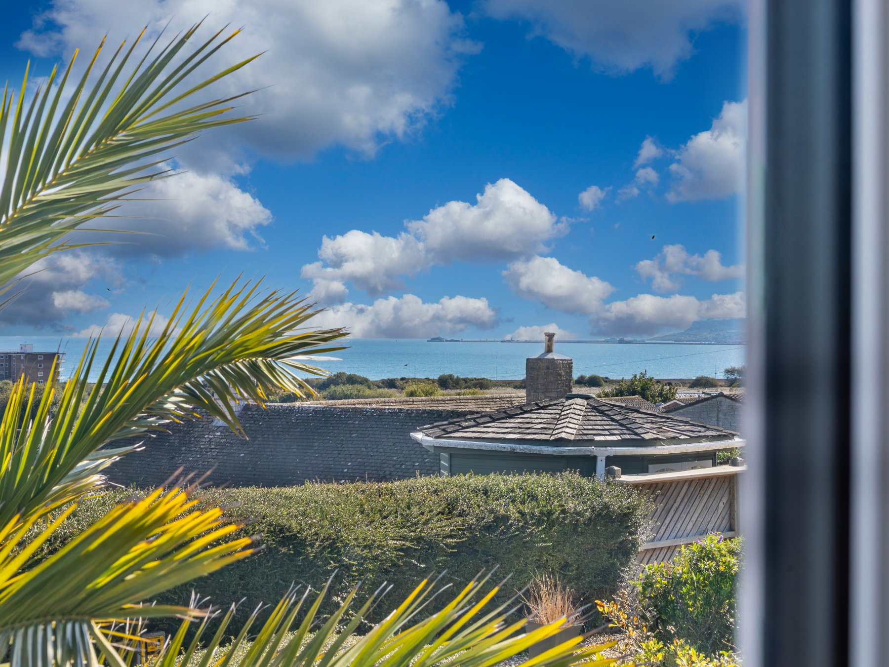 A bright and engaging bungalow which enjoys views of the sea from its elevated position. On entering the property, the FRONT LOBBY offers a useful coats cupboard and leads into the SITTING ROOM, a bright and welcoming space with a double aspect and views across rooftops to the SEA beyond. A modern gas fire creates a cosy focal point.