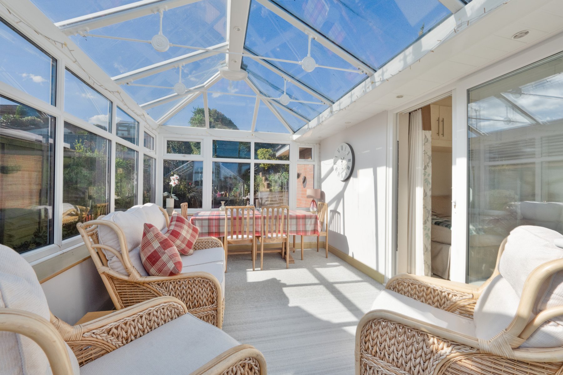 The property offers three bedrooms and a bathroom. The PRINCIPAL BEDROOM has a range of fitted wardrobes (part mirrored), with matching drawers and bedside cabinets included. BEDROOM TWO also has fitted wardrobes, bedside cabinets, and a dressing table, all included. BEDROOM THREE, used as both a study and occasional bedroom, has fitted units with a desk and also a door opening into the CONSERVATORY, which has French doors leading out to the patio with SEA VIEWS beyond.